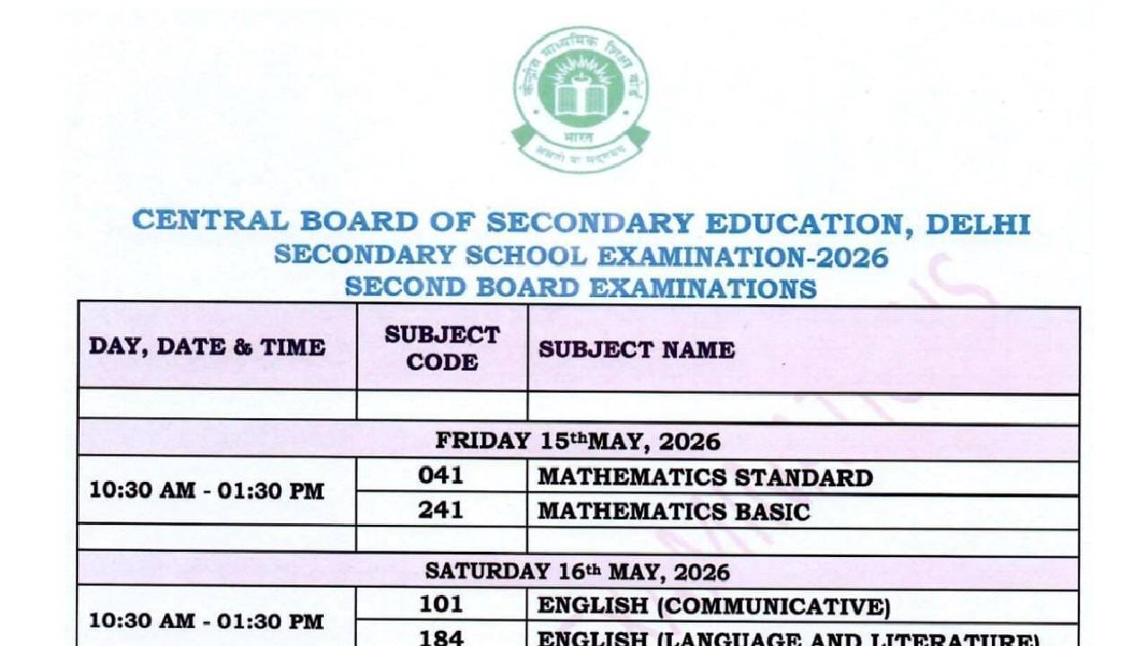 CBSE 10 Second Board Exam: CBSE 10ನೇ ತರಗತಿ ಎರಡನೇ ಬಾರಿಯ ಬೋರ್ಡ್ ಪರೀಕ್ಷಾ ವೇಳಾಪಟ್ಟಿ ಪ್ರಕಟ; ಮೇ 15ರಿಂದ ಪರೀಕ್ಷೆ ಆರಂಭ