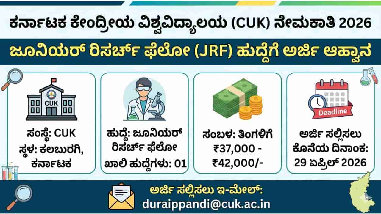 ಕರ್ನಾಟಕ ಕೇಂದ್ರೀಯ ವಿಶ್ವವಿದ್ಯಾಲಯವು (CUK) ಖಾಲಿ ಇರುವ ಜೂನಿಯರ್ ರಿಸರ್ಚ್ ಫೆಲೋ (JRF) ಹುದ್ದೆಯನ್ನು ಭರ್ತಿ ಮಾಡಲು ಅರ್ಹ ಅಭ್ಯರ್ಥಿಗಳಿಂದ ಅರ್ಜಿಗಳನ್ನು ಆಹ್ವಾನಿಸಿದೆ. ಕಲಬುರಗಿಯಲ್ಲಿ ಸಂಶೋಧನಾ ಕ್ಷೇತ್ರದಲ್ಲಿ ವೃತ್ತಿಜೀವನವನ್ನು ಆರಂಭಿಸಲು ಬಯಸುವ ಉದ್ಯೋಗಾಕಾಂಕ್ಷಿಗಳಿಗೆ ಇದೊಂದು ಉತ್ತಮ ಅವಕಾಶವಾಗಿದ್ದು, ಅಧಿಕೃತ ಅಧಿಸೂಚನೆಯ ಮೂಲಕ ಈ ನೇಮಕಾತಿ ಪ್ರಕ್ರಿಯೆಯನ್ನು ಕೈಗೊಳ್ಳಲಾಗಿದೆ. ಈ ಹುದ್ದೆಗೆ ಆಯ್ಕೆಯಾಗುವ ಅಭ್ಯರ್ಥಿಗಳಿಗೆ ಮಾಸಿಕ 37,000 ರೂ. ನಿಂದ 42,000 ರೂ. ವರೆಗೆ ಆಕರ್ಷಕ ವೇತನ ಶ್ರೇಣಿಯನ್ನು ನೀಡಲಾಗುತ್ತದೆ.
