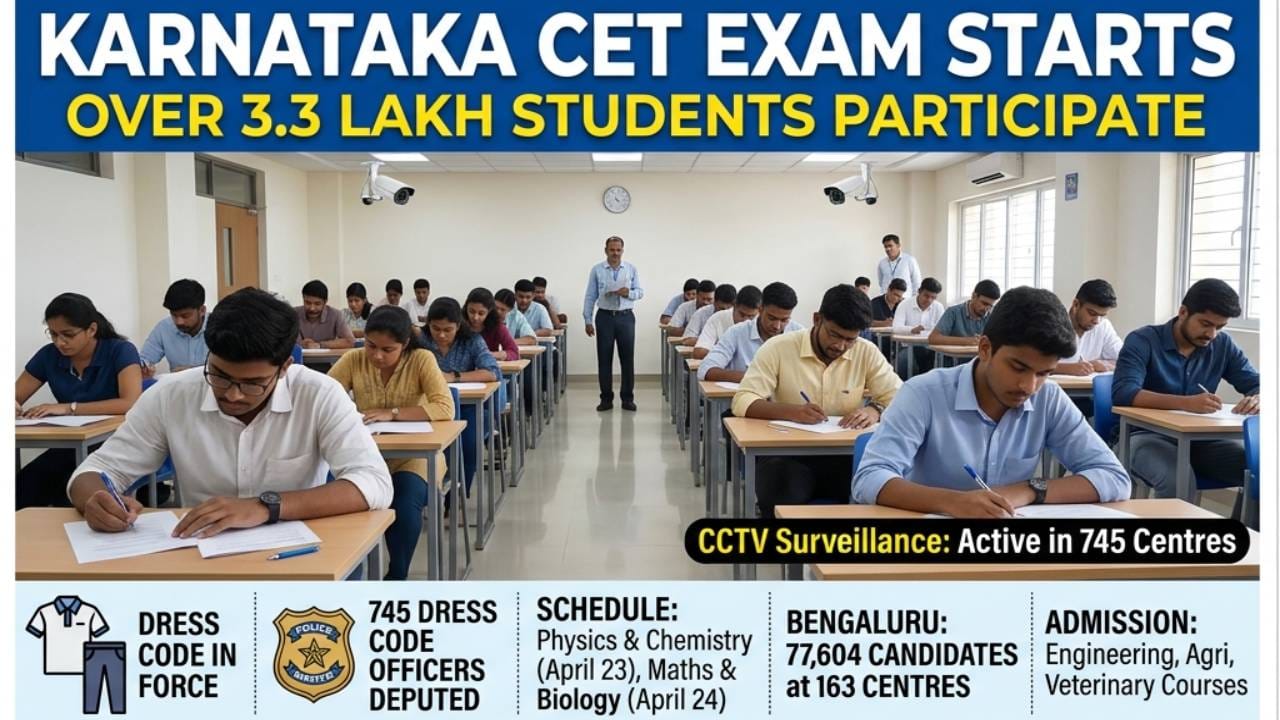 2026ರ ಕರ್ನಾಟಕ CET ಪರೀಕ್ಷೆ ಇಂದಿನಿಂದ ಆರಂಭವಾಗಿದ್ದು, KEA ವತಿಯಿಂದ ವೃತ್ತಿಪರ ಕೋರ್ಸ್ಗಳ ಪ್ರವೇಶಕ್ಕಾಗಿ ನಡೆಯುತ್ತಿದೆ. ಈ ವರ್ಷ ದಾಖಲೆಯ ಸಂಖ್ಯೆಯ 3.3 ಲಕ್ಷ ವಿದ್ಯಾರ್ಥಿಗಳು ನೋಂದಾಯಿಸಿಕೊಂಡಿದ್ದಾರೆ. ಪರೀಕ್ಷಾ ಕೇಂದ್ರಗಳಲ್ಲಿ ಕಟ್ಟುನಿಟ್ಟಿನ ಡ್ರೆಸ್ ಕೋಡ್, ಎಲೆಕ್ಟ್ರಿಕ್ ಸಾಧನಗಳ ನಿಷೇಧ ಹಾಗೂ ಹೈಟೆಕ್ ಭದ್ರತೆ ಜಾರಿಗೊಳಿಸಲಾಗಿದೆ. ಪರೀಕ್ಷೆಗೆ ಹಾಜರಾಗುವ ಮುನ್ನ ವಿದ್ಯಾರ್ಥಿಗಳು ಕೆಇಎ ಅಧಿಕೃತ ವೆಬ್ಸೈಟ್ನಲ್ಲಿರುವ ಮಾರ್ಗಸೂಚಿಗಳನ್ನು ಮತ್ತೊಮ್ಮೆ ಪರಿಶೀಲಿಸಿಕೊಳ್ಳುವಂತೆ ಪ್ರಾಧಿಕಾರ ಮನವಿ ಮಾಡಿದೆ.