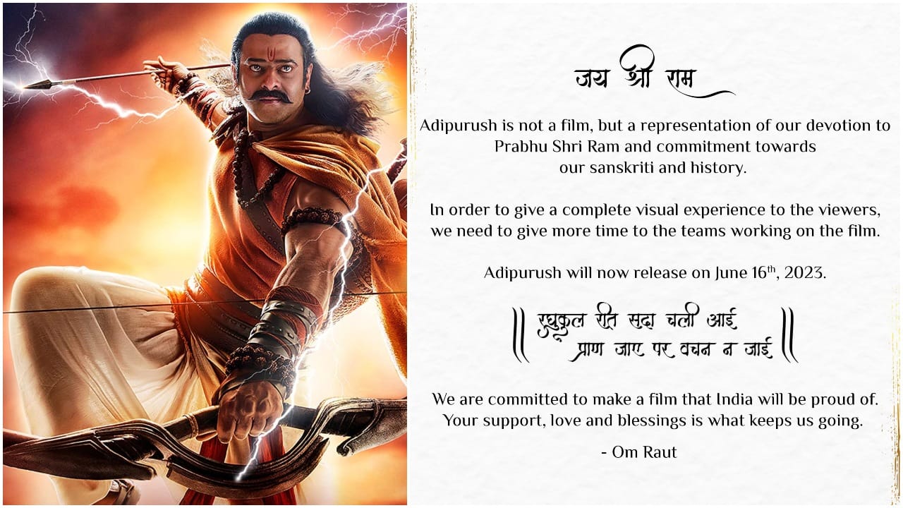 जय श्री राम…#Adipurush releases IN THEATRES on June 16, 2023.#Prabhas #SaifAliKhan @kritisanon @mesunnysingh #BhushanKumar #KrishanKumar @vfxwaala @rajeshnair06 #ShivChanana @manojmuntashir @TSeries @RETROPHILES1 @UV_Creations @Offladipurush pic.twitter.com/kXNnjlEsib