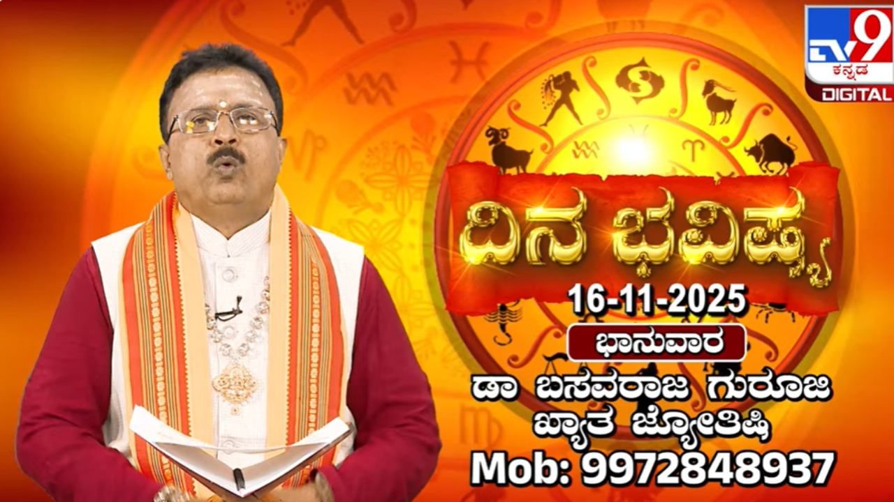 ನವೆಂಬರ್ 16ರ ಭಾನುವಾರದ ದಿನಭವಿಷ್ಯವನ್ನು ಖ್ಯಾತ ಜ್ಯೋತಿಷಿ ಡಾ. ಬಸವರಾಜ ಗುರೂಜಿ ನೀಡಿದ್ದಾರೆ. ವೃಶ್ಚಿಕ ಸಂಕ್ರಮಣದ ವಿಶೇಷತೆಯೊಂದಿಗೆ, ಮೇಷ ಮತ್ತು ವೃಷಭ ರಾಶಿಗಳ ಫಲಾಫಲಗಳನ್ನು ಕುರಿತು ವಿವರಿಸಲಾಗಿದೆ. ಆರ್ಥಿಕ ಲಾಭ, ವೃತ್ತಿ ಪ್ರಗತಿ, ಕೌಟುಂಬಿಕ ಸಂತೋಷ ಹಾಗೂ ಪ್ರಯಾಣದ ಯೋಗಗಳ ಬಗ್ಗೆ ಮಾಹಿತಿ ಲಭ್ಯವಿದೆ.