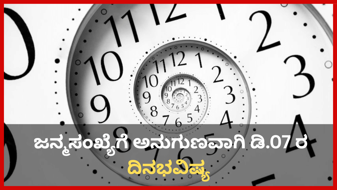 ನಿಮ್ಮ ಜನ್ಮಸಂಖ್ಯೆಗೆ ಅನುಗುಣವಾಗಿ ಇಲ್ಲಿ ದಿನಭವಿಷ್ಯವನ್ನು ನೀಡಲಾಗಿದೆ. ಜನ್ಮಸಂಖ್ಯೆಯನ್ನು ತಿಳಿದುಕೊಳ್ಳುವುದು ಹೇಗೆ ಎಂಬುದಕ್ಕೆ ಇಲ್ಲಿ ಮಾಹಿತಿ ನೀಡಲಾಗಿದೆ. ಜನ್ಮಸಂಖ್ಯೆಯ ಆಧಾರದಲ್ಲಿ ಡಿಸೆಂಬರ್ 7ರ ಭಾನುವಾರದ ದಿನ ಭವಿಷ್ಯ ಹೇಗಿದೆ ಎಂಬ ಮಾಹಿತಿ ಇಲ್ಲಿದೆ. ಜೀವನದ ಸವಾಲುಗಳನ್ನು ಎದುರಿಸಲು ಈ ಭವಿಷ್ಯ ನಿಮಗೆ ಸಹಾಯಕವಾಗಲಿದೆ.