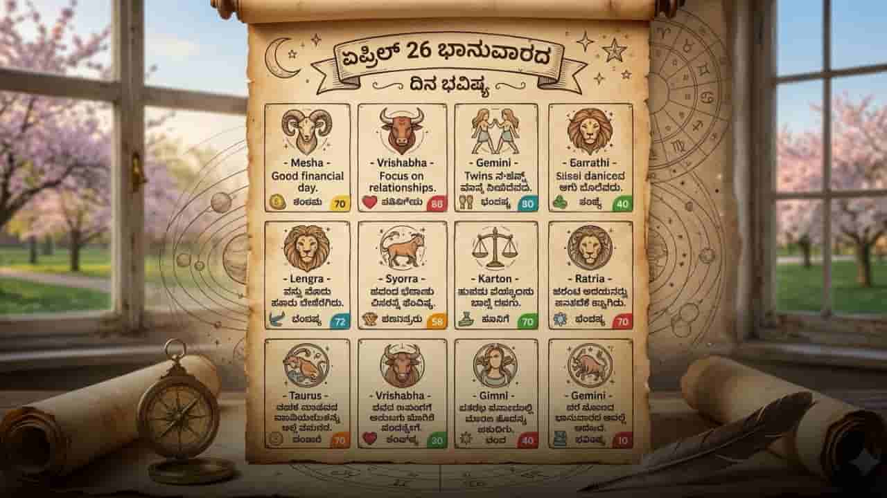 Daily Horoscope, 26 April 2026: ಶಾಲಿವಾಹನ ಶಕವರ್ಷ 1949ರ ಉತ್ತರಾಯಣ, ವಸಂತ ಋತುವಿನ ವೈಶಾಖ ಮಾಸದ ಶುಕ್ಲ ಪಕ್ಷದ ನವಮೀ ತಿಥಿಯ ಭಾನುವಾರದಂದು ದುರಭ್ಯಾಸದಿಂದ ತೊಂದರೆ, ಸಂಬಂಧವಿಲ್ಲದ ಕಲಹದಲ್ಲಿ ಭಾಗಿ, ಬಂಧುಗಳ ವಿರೋಧ, ಸಾಮಾಜಿಕ ಸಮಾರಂಭದಲ್ಲಿ ಸಕ್ರಿಯ ಇವೆಲ್ಲ ಇಂದಿನ ಭವಿಷ್ಯ.