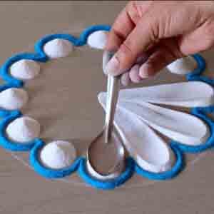 ಟ್ರೆಂಡಿಂಗ್ ಅಂಡ್ ಈಜಿ ಸ್ಪೂನ್ ರಂಗೋಲಿ ಹೌದು ಕೆಲ ದಿನಗಳಿಂದ ಸ್ಪೂನ್ನಿಂದ ಬಿಡಿಸುವ ರಂಗೋಲಿ ಭಾರೀ ಟ್ರೆಂಡಿಂಗ್ ಆಗಿದೆ. ಇದು ತುಂಬಾ ಸುಲಭ ಹಾಗೂ ಆಕರ್ಷಕ. ಕೆಲವರಿಗೆ ರಂಗೋಲಿ ಪುಡಿಯನ್ನು ಕೈಯಲ್ಲಿ ಹಿಡಿಯಲು ಸಹ ಬರಲ್ಲ. ಅಂಥವರೂ ಸಹ ಈ ರಂಗೋಲಿಯನ್ನು ಟ್ರೈ ಮಾಡಬಹುದು. ವಿವಿಧ ಬಣ್ಣಗಳು, ಒಂದು ಸ್ಪೂನ್ ಇದ್ರೆ ಸಾಕು.