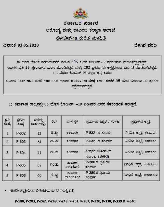 ಇಂದು ದೃಢವಾದ ಸೋಂಕಿತರ ವಿವರ ಹೀಗಿದೆ: 602ನೇ ಸೋಂಕಿತೆ ಕಲಬುರಗಿಯ 13 ವರ್ಷದ ಯುವತಿ 532ನೇ ಸೋಂಕಿತರ ಸಂಪರ್ಕದಿಂದ ಯುವತಿಗೆ ಸೋಂಕು 603ನೇ ಸೋಂಕಿತ ಕಲಬುರಗಿಯ 54 ವರ್ಷದ ಪುರುಷ 532ನೇ ಸೋಂಕಿತರ ಸಂಪರ್ಕದಿಂದ ವ್ಯಕ್ತಿಗೆ ಸೋಂಕು 604ನೇ ಸೋಂಕಿತ ಕಲಬುರಗಿಯ 41 ವರ್ಷದ ಪುರುಷ ಉಸಿರಾಟದ ಸಮಸ್ಯೆಯಿಂದ ಆಸ್ಪತ್ರೆಗೆ ದಾಖಲಾಗಿದ್ದರು 605ನೇ ಸೋಂಕಿತ ಮುಧೋಳದ 68 ವರ್ಷದ ವೃದ್ಧ ಬಾಗಲಕೋಟೆ ಜಿಲ್ಲೆಯ ಮುಧೋಳದ ವೃದ್ಧನಿಗೆ ಸೋಂಕು 380ನೇ ಸೋಂಕಿತರ ಸಂಪರ್ಕದಿಂದ ವೃದ್ಧನಿಗೆ ಸೋಂಕು 606ನೇ ಸೋಂಕಿತೆ ಮುಧೋಳದ 60 ವರ್ಷದ ವೃದ್ಧೆ 380ನೇ ಸೋಂಕಿತರ ಸಂಪರ್ಕದಿಂದ ವೃದ್ಧನಿಗೆ ಸೋಂಕು