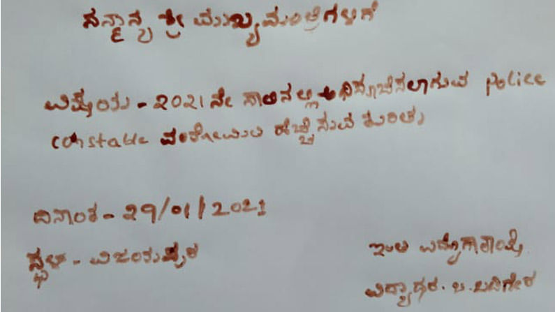 ಬೆಂಗಳೂರು: ಪೊಲೀಸ್ ಕಾನ್ಸ್ಟೆಬಲ್ ಪರೀಕ್ಷೆ ಬರೆಯಲು ನಿಗದಿಪಡಿಸಿರುವ ವಯೋಮಿತಿಯನ್ನು ಹೆಚ್ಚಿಸಲು ಕೋರಿ ಯುವಕರೊಬ್ಬರು ಗೃಹ ಸಚಿವ ಬಸವರಾಜ ಬೊಮ್ಮಾಯಿಗೆ ರಕ್ತದಲ್ಲಿ ಪತ್ರ ಬರೆದಿದ್ದಾರೆ. ವಿಜಯಪುರದ ವಿದ್ಯಾಧರ ಬಿ.ಬಡಿಗೇರ ಎಂಬ ಯುವಕ ರಕ್ತದಲ್ಲಿ ಪತ್ರ ಬರೆದಿದ್ದು, ಈ ಬಾರಿಯಿಂದ ಪೊಲೀಸ್ ಕಾನ್ಸ್ಟೆಬಲ್ ಹುದ್ದೆಗಳ ನೇಮಕಕ್ಕೆ ವಯೋಮಿತಿ ಹೆಚ್ಚಿಸುವಂತೆ ಮನವಿ ಮಾಡಿದ್ದಾರೆ.
