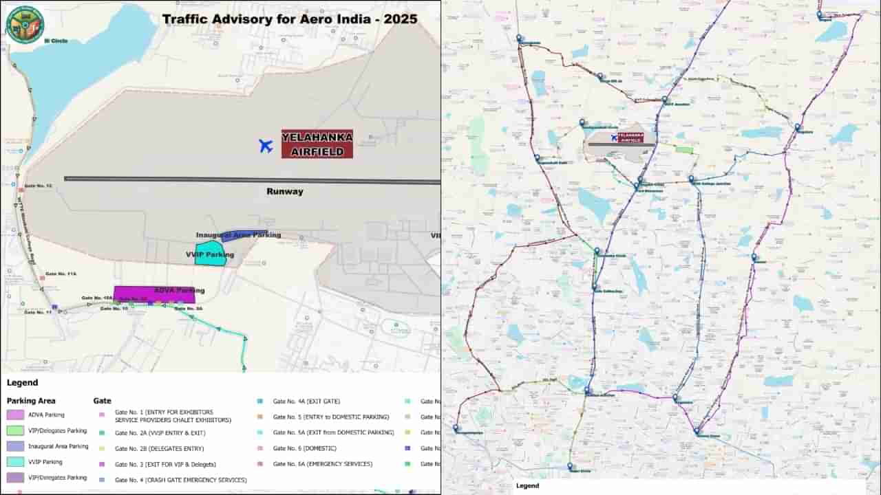 - ಬೆಂಗಳೂರು ಪೂರ್ವ ದಿಕ್ಕಿನಿಂದ ಅಡ್ವಾ (ಏರ್ ಡಿಸ್ಪ್ಲೇ ಪ್ರದೇಶ) ಪಾರ್ಕಿಂಗ್ ಕಡೆ ಬರುವವರು ಕೆ.ಆರ್.ಪುರ – ನಾಗವಾರ ಜಂಕ್ಷನ್ – ಬಲತಿರುವು – ಥಣಿಸಂದ್ರ – ನಾರಾಯಣಪುರ ಕ್ರಾಸ್ – ಎಡ ತಿರುವು – ಟೆಲಿಕಾ೦ ಲೇಔಟ್ – ಜಕ್ಕೂರು ಕ್ರಾಸ್ – ಬಲ ತಿರುವು – ಯಲಹಂಕ ಬೈಪಾಸ್ – ಯಲಹಂಕ ಕಾಫಿ ಡೇ – ಪಾಲನಹಳ್ಳಿ ಗೇಟ್ ಸರ್ವಿಸ್ ರಸ್ತೆ (ಗ್ರೀಲ್ ಓಪನ್) ಫೋರ್ಡ್ ಷೋ ರೂಂ – ಎಡ ತಿರುವು – ನಿಟ್ಟೆ ಮೀನಾಕ್ಷಿ ಕಾಲೇಜ್ ರಸ್ತೆ ಯಿಂದ ಬರಬೇಕು ಎಂದು ಟ್ರಾಫಿಕ್ ಪೊಲೀಸ್ ಪ್ರಕಟಣೆ ತಿಳಿಸಿದೆ.