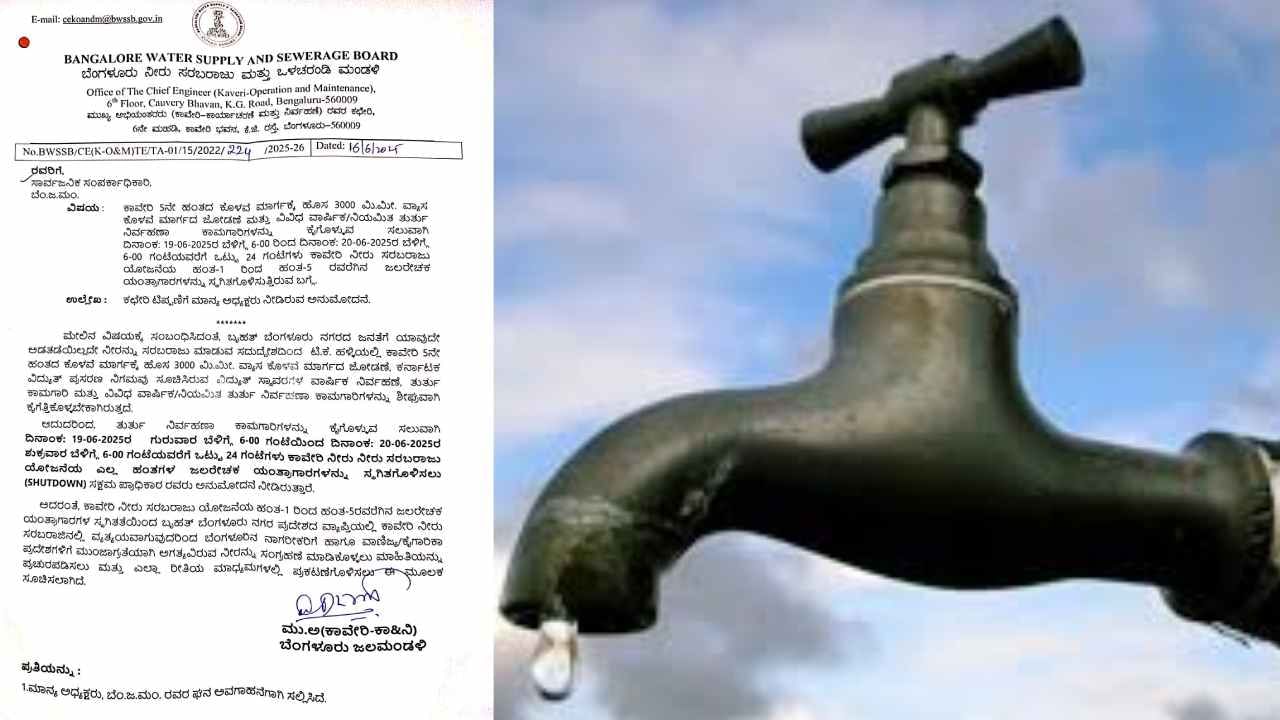 ತುರ್ತು ನಿರ್ವಹಣಾ ಕಾಮಗಾರಿಗಳನ್ನು ಕೈಗೊಳ್ಳುವ ಸಲುವಾಗಿ ಜೂನ್ 19 ರ ಬೆಳಗ್ಗೆ 6 ರಿಂದ ಹಾಗೂ ಜೂ.20ರ ಬೆಳಗ್ಗೆ 6 ಗಂಟೆ ವರೆಗೆ ಕಾವೇರಿ ನೀರು ಸರಬರಾಜು ಯೋಜನೆಯ ಹಂತ-1 ರಿಂದ ಹಂತ- 5ರ ವರೆಗಿನ ಎಲ್ಲಾ ಜಲರೇಚಕ ಯಂತ್ರಾಗಾರಗಳನ್ನು ಸ್ಥಗಿತಗೊಳಿಸಲಾಗುತ್ತಿದೆ. ಇದರಿಂದ ಬಿಬಿಎಂಪಿ ನಗರ ಪ್ರದೇಶದ ವ್ಯಾಪ್ತಿಯಲ್ಲಿ ಕಾವೇರಿ ನೀರು ಸರಬರಾಜಿನಲ್ಲಿ ವ್ಯತ್ಯಯವಾಗುತ್ತದೆ. ಹೀಗಾಗಿ ಬೆಂಗಳೂರಿನ ನಾಗರೀಕರಿಗೆ, ವಾಣಿಜ್ಯ ಹಾಗೂ ಕೈಗಾರಿಕಾ ಪ್ರದೇಶಗಳಿಗೆ ಮುಂಜಾಗ್ರತೆಯಾಗಿ ಅಗತ್ಯವಿರುವ ನೀರನ್ನು ಸಂಗ್ರಹಣೆ ಮಾಡಿಕೊಳ್ಳುವಂತೆ ಜಲಮಂಡಳಿ ಸೂಚನೆ ನೀಡಿದೆ.
