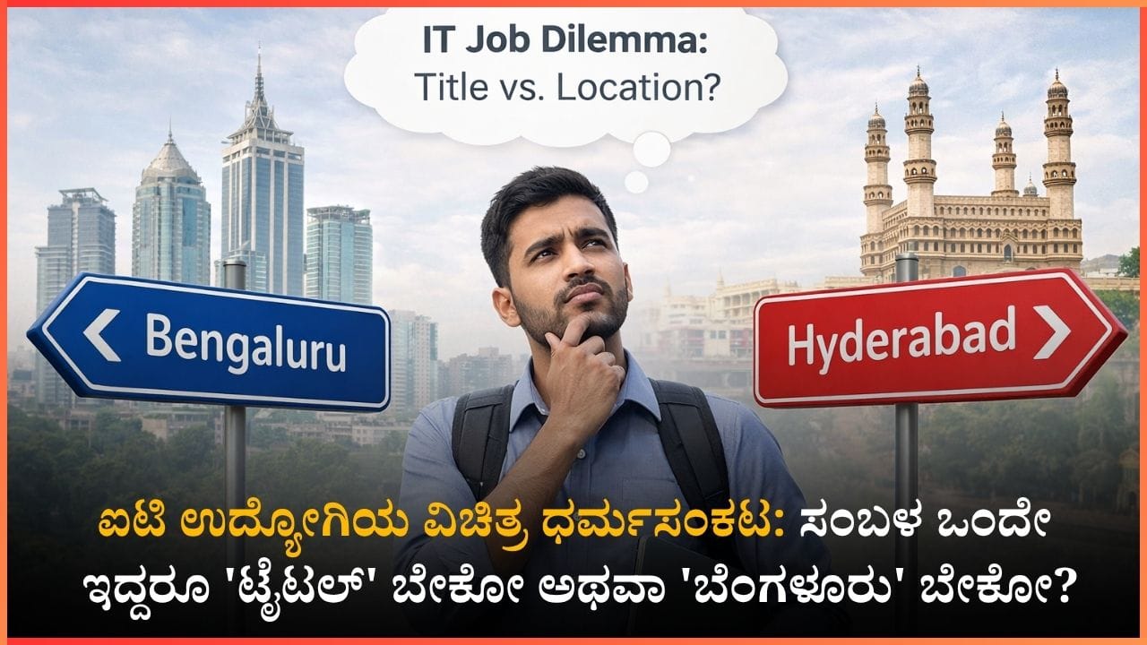 ಐಟಿ ಉದ್ಯೋಗಿಗಳಿಗೆ ಈಗ ಹೊಸ ಗೊಂದಲ: ಹುದ್ದೆಯ ಹೆಸರು ಮುಖ್ಯವೋ ಅಥವಾ ವಾಸಿಸುವ ನಗರ ಮುಖ್ಯವೋ? ಪ್ರತಿಷ್ಠಿತ MNC ಯಲ್ಲಿ 8 ವರ್ಷಗಳ ಅನುಭವದ ಅಭ್ಯರ್ಥಿಯೊಬ್ಬರಿಗೆ ಹೈದರಾಬಾದ್ನಲ್ಲಿ 'ಸೀನಿಯರ್ ಮ್ಯಾನೇಜರ್' ಅಥವಾ ಬೆಂಗಳೂರಿನಲ್ಲಿ 'ಮ್ಯಾನೇಜರ್' ಹುದ್ದೆಯ ಆಯ್ಕೆ ನೀಡಲಾಗಿದೆ, ಎರಡಕ್ಕೂ ಸಂಬಳ ಒಂದೇ. ಈ ವಿಷಯ ಸಾಮಾಜಿಕ ಜಾಲತಾಣಗಳಲ್ಲಿ ಭಾರೀ ಚರ್ಚೆ ಹುಟ್ಟುಹಾಕಿದ್ದು, ವೃತ್ತಿ ಭವಿಷ್ಯ ಮತ್ತು ವೈಯಕ್ತಿಕ ಆಯ್ಕೆಗಳ ನಡುವಿನ ಸಂಘರ್ಷವನ್ನು ಎತ್ತಿ ತೋರಿಸಿದೆ.