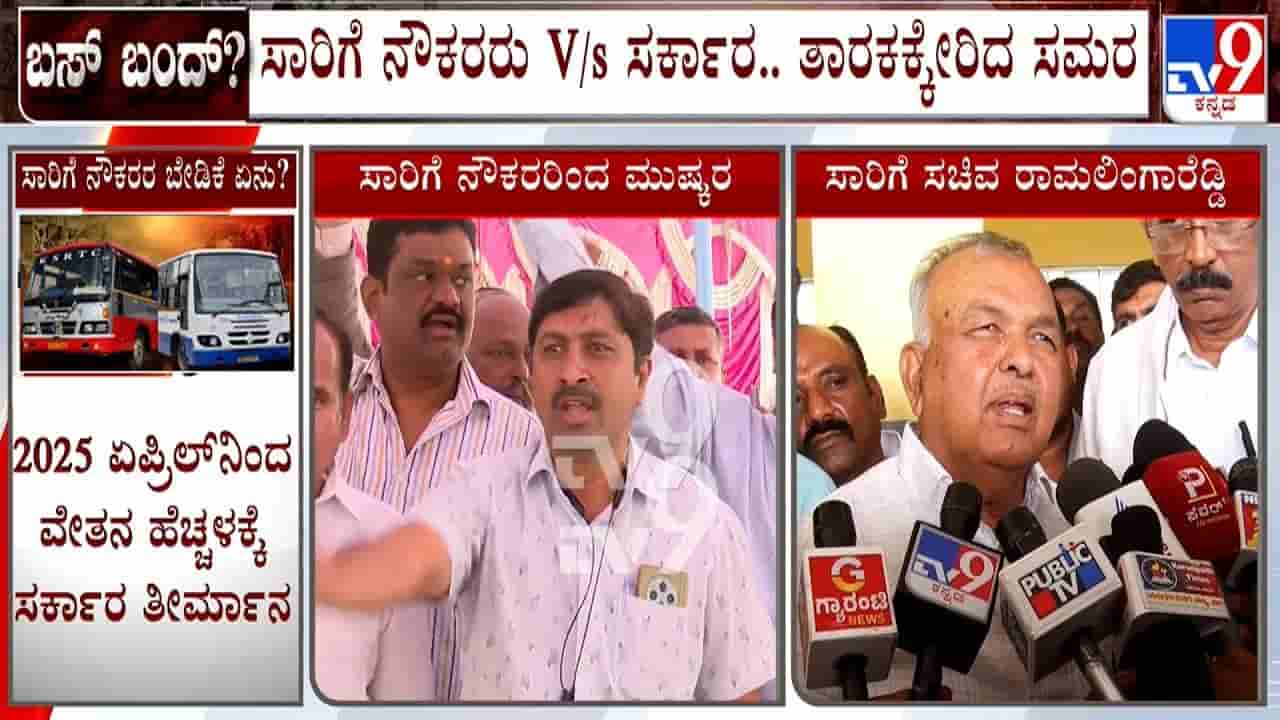 ಬೆಂಗಳೂರು, (ಫೆಬ್ರವರಿ 19): ವಿವಿಧ ಬೇಡಿಕೆ ಈಡೇರಿಗೆ ಆಗ್ರಹಿಸಿ ‘ಬೆಂಗಳೂರು ಚಲೋ’ ಪ್ರತಿಭಟನೆ (Karnataka Transport employees strike) ಹಮ್ಮಿಕೊಂಡಿದ್ದ ಕರ್ನಾಟಕ ರಾಜ್ಯ ಸಾರಿಗೆ ನೌಕರರು ಮುಷ್ಕರವನ್ನು ತಾತ್ಕಾಲಿಕವಾಗಿ ಹಿಂಪಡೆದಿದ್ದಾರೆ. ರಾಜ್ಯ ಸರ್ಕಾರದ ವೇತನ ಪರಿಷ್ಕರಣೆ ಆದೇಶ ಹಾಗೂ ಹಲವು ತಿಂಗಳ ಹಿಂಬಾಕಿ ನೀಡಲು ಮಾರ್ಚ್ 2ರ ಗಡುವು ನೀಡಿದೆ.38 ತಿಂಗಳ ಹಿಂಬಾಕಿ ಪೈಕಿ 26 ತಿಂಗಳ ಹಿಂಬಾಕಿ ನೀಡುವುದಾಗಿ ಸರ್ಕಾರ ನಿರ್ಧಾರ ತೆಗೆದುಕೊಂಡಿದೆ. ಅಲ್ಲದೇ ವೇತನ ಪರಿಷ್ಕರಣೆಗೂ ಸಹ ಸರ್ಕಾರ ಒಪ್ಪಿಕೊಂಡಿದೆ. ಆದರೂ ಸಾರಿಗೆ ನೌಕರರಿಗೆ ತೃಪ್ತಿ ತಂದಿಲ್ಲ. 38 ತಿಂಗಳ ಹಿಂಬಾಕಿ ಹಣ ನೀಡಬೇಕೆಂದು ಪಟ್ಟಿ ಹಿಡಿದಿದ್ದಾರೆ. ಈ ಸಂಬಂಧ ಸ್ಥಳಕ್ಕೆ ಕೆಎಸ್ಆರ್ಟಿಸಿ ಎಂಡಿ ಫ್ರೀಡಂಪಾರ್ಕ್ ನಲ್ಲಿ ನಡೆಯುತ್ತಿದ್ದ ಪ್ರತಿಭಟನಾ ಸ್ಥಳಕ್ಕೆ ಭೇಟಿ ನೀಡಿ ನೌಕರರ ಜತೆ ಚರ್ಚಿಸಿದರು. ಬಳಿಕ ಅಂತಿಮವಾಗಿ ಸಭೆ ಮಾಡಿ ಮುಷ್ಕರವನ್ನು ತಾತ್ಕಾಲಿಕವಾಗಿ ಹಿಂಪಡೆದುಕೊಂಡಿದ್ದಾರೆ.