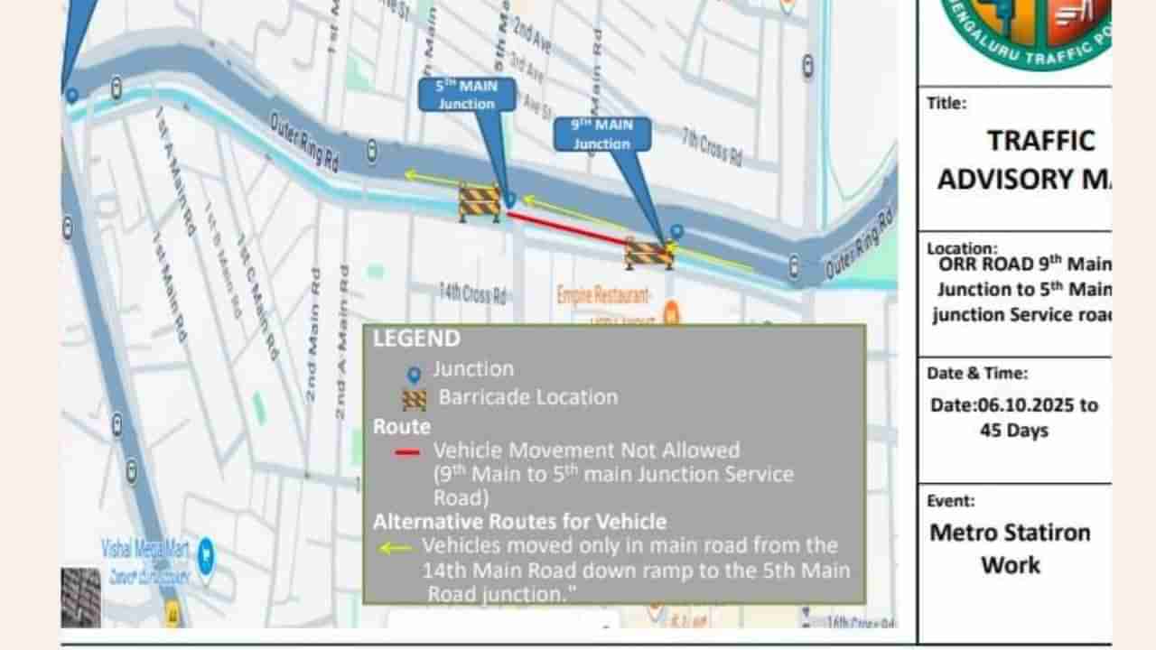 ಬೆಂಗಳೂರು, ಅ.9: ಬಿಎಂಆರ್ಸಿಎಲ್ ಮೆಟ್ರೋ ನಿಲ್ದಾಣ (BMRCL metro station) ನಿರ್ಮಾಣ ಕಾರ್ಯ ನಡೆಯುತ್ತಿರುವುದರಿಂದ ಹೊರ ವರ್ತುಲ ರಸ್ತೆ ( ಒಆರ್ಆರ್ ) ಸರ್ವಿಸ್ ರಸ್ತೆಯನ್ನು ಬಂದ್ ಮಾಡಲಾಗಿದೆ. ಈ ಬಗ್ಗೆ ಬೆಂಗಳೂರು ಸಂಚಾರ ಪೊಲೀಸರು ಸಂಚಾರ ಸಲಹೆಯನ್ನು ನೀಡಿದ್ದಾರೆ. ಈ ಪ್ರದೇಶದಲ್ಲಿ ಬರುವ 9ನೇ ಮುಖ್ಯ ರಸ್ತೆ ಜಂಕ್ಷನ್ನಿಂದ 5ನೇ ಮುಖ್ಯ ರಸ್ತೆ ಜಂಕ್ಷನ್ವರೆಗೆ ಸಾಗುತ್ತದೆ . ಇದೀಗ ಈ ರಸ್ತೆಯನ್ನು ಅಕ್ಟೋಬರ್ 6 ರಿಂದ 45 ದಿನಗಳವರೆಗೆ ಮುಚ್ಚಲಾಗುತ್ತದೆ. ಇಬ್ಬ್ಲೂರಿನಿಂದ ಸಿಲ್ಕ್ ಬೋರ್ಡ್ ಜಂಕ್ಷನ್ ಕಡೆಗೆ ಬರುವ ವಾಹನಗಳು ಪರ್ಯಾಯ ಮಾರ್ಗಗಳನ್ನು ಆಯ್ಕೆ ಮಾಡಿಕೊಳ್ಳಬೇಕು ಎಂದು ಹೇಳಿದ್ದಾರೆ. ವಾಹನ ಸವಾರರು 14ನೇ ಮುಖ್ಯ ರಸ್ತೆ ಮೇಲ್ಸೇತುವೆ ಮೂಲಕ ಪ್ರಯಾಣಿಸಿ ಮುಖ್ಯ ರಸ್ತೆಯಲ್ಲಿ ಬಂದು 5ನೇ ಮುಖ್ಯ ರಸ್ತೆ ಜಂಕ್ಷನ್ ತಲುಪಬಹುದು ಅಥವಾ ಎಚ್ಎಸ್ಆರ್ ಲೇಔಟ್ನ ರಸ್ತೆಗಳನ್ನು ಬಳಸಿಕೊಂಡು ಸಿಲ್ಕ್ ಬೋರ್ಡ್ ಮತ್ತು ಹೊಸೂರು ಮುಖ್ಯ ರಸ್ತೆ ಕಡೆಗೆ ಸಾಗಬಹುದು ಎಂದು ಹೇಳಿದ್ದಾರೆ