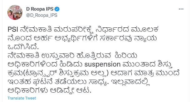 ಪಿಎಸ್ಐ ನೇಮಕಾತಿ ಮರುಪರೀಕ್ಷೆ ನಿರ್ಧಾರ: ಐಪಿಎಸ್ ಅಧಿಕಾರಿ ಡಿ. ರೂಪಾ ಟ್ವೀಟ್