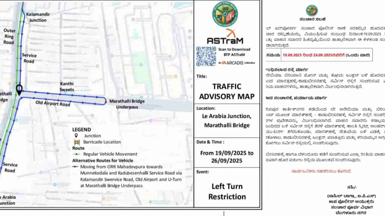 ಮಹದೇವಪುರ ಕಾರ್ತಿಕ್ ನಗರ ಕಡೆಯಿಂದ ಲೇ ಅರೇಬಿಯಾ ಮತ್ತು ಬಿರಿಯಾನಿ ಪಾಯಿಂಟ್ ಮೂಲಕ ಮಾರತಹಳ್ಳಿ- ಕಾಡುಬೀಸನಹಳ್ಳಿ ಸರ್ವಿಸ್ ರಸ್ತೆಗೆ ಸಂಚರಿಸುವ ವಾಹನಗಳ ಪ್ರವೇಶವನ್ನು ನಿರ್ಬಂಧಿಸಲಾಗಿದೆ. ವಾಹನ ಸವಾರರು ಕಡ್ಡಾಯವಾಗಿ ಕಲಾಮಂದಿರದ ಬಳಿ ಸರ್ವಿಸ್ ರಸ್ತೆಗೆ ತೆರಳಿ ಮಾರತಹಳ್ಳಿ ಕಾಂತಿ ಸ್ವೀಟ್ಸ್ ಅಂಡರ್ ಪಾಸ್ ಬಳಿ ಯುಟರ್ನ್ ತೆಗೆದುಕೊಳ್ಳಬೇಕು. ಬಳಿಕ ಮಾರತಹಳ್ಳಿ ಸೇತುವೆಯ ಬಳಿ ಎಡಕ್ಕೆ ತಿರುಗಿ ಮುನ್ನೇಕೊಳಾಲ ಕಾಡುಬೀಸನಹಳ್ಳಿ ಜಂಕ್ಷನ್, ಪಣತ್ತೂರು ಮತ್ತು ಕರಿಯಮ್ಮನ ಅಗ್ರಹಾರ ಕಡೆಗೆ ಹೋಗಲು ಸರ್ವಿಸ್ ರಸ್ತೆಯಲ್ಲಿ ಸಂಚರಿಸಬಹುದು.