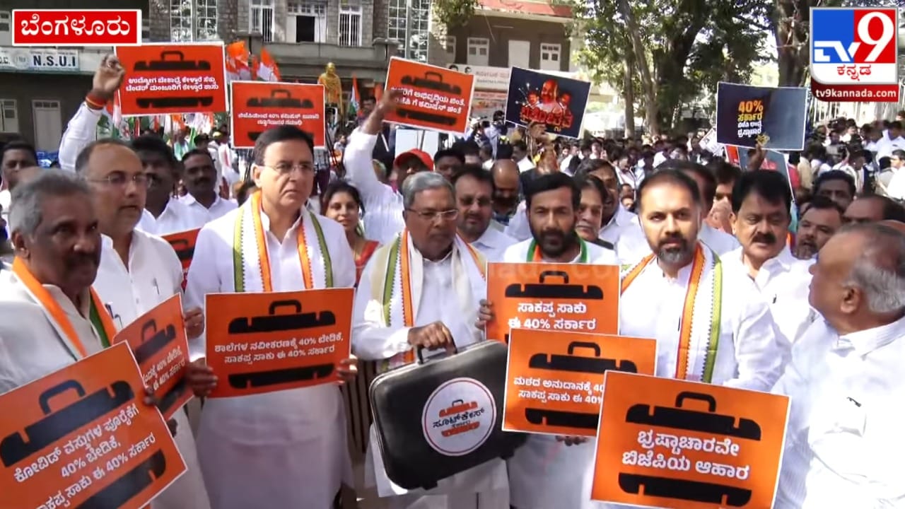 ಬೆಂಗಳೂರು: ಶಾಸಕ ಮಾಡಾಳ್ ವಿರೂಪಾಕ್ಷಪ್ಪ (Madal Virupakshappa) ಪುತ್ರನ ಮನೆಯಲ್ಲಿ ಕೋಟಿ ಕೋಟಿ ಹಣ ಪತ್ತೆ ಪ್ರಕರಣಕ್ಕೆ ಸಂಬಂಧಿಸಿದಂತೆ ಮುಖ್ಯಮಂತ್ರಿ ಬಸವರಾಜ ಬೊಮ್ಮಾಯಿ (Basavaraj Bommai) ರಾಜಿನಾಮೆ ನೀಡಬೇಕೆಂದು ಆಗ್ರಹಿಸಿ ರಾಜ್ಯ ಕಾಂಗ್ರೆಸ್ (Karnataka Congress) ನಾಯಕರು ನಗರದ ರೇಸ್ ಕೋರ್ಸ್ ರಸ್ತೆಯ ಕಾಂಗ್ರೆಸ್ ಭವನದ ಬಳಿ ಪ್ರತಿಭಟನೆ ಮಾಡುತ್ತಿದ್ದಾರೆ. ಪ್ರತಿಭಟನೆ ವೇಳೆ ಪೋಸ್ಟರ್, ಸೂಟ್ಕೇಸ್, ಹಣವಿರುವ ಗುಟ್ಕಾ ಬ್ಯಾಗ್, ನಕಲಿ ನೋಟ್ ಪ್ರದರ್ಶಿಸಿ ಪ್ರತಿಭಟಿಸುತ್ತಿದ್ದಾರೆ. ಪ್ರತಿಭಟನೆಯಲ್ಲಿ ರಾಜ್ಯ ಕಾಂಗ್ರೆಸ್ ಉಸ್ತುವಾರಿ ಸುರ್ಜೇವಾಲ, ವಿಪಕ್ಷನಾಯಕ ಸಿದ್ದರಾಮಯ್ಯ, ಶಾಸಕ ರಾಮಲಿಂಗಾರೆಡ್ಡಿ, ಶಾಸಕ ದಿನೇಶ್ ಗುಂಡೂರಾವ್, ಕೆ.ಜೆ.ಜಾರ್ಜ್, ಕೃಷ್ಣ ಭೈರೇಗೌಡ ಹಾಗೂ ಸಲೀಂ ಅಹ್ಮದ್ ಭಾಗಿಯಾಗಿದ್ದಾರೆ.