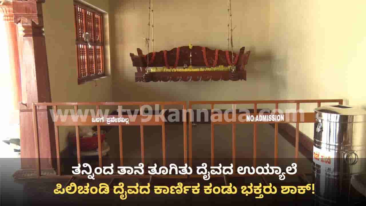 ಮಂಗಳೂರು, ಫೆಬ್ರವರಿ 17: ಕರಾವಳಿಯಲ್ಲಿ (Coastal Karnataka) ಮತ್ತೆ ದೈವದ ಕಾರ್ಣಿಕದ ಕಂಡು ಭಕ್ತರು ಚಕಿತರಾಗಿದ್ದಾರೆ. ಮಂಗಳೂರಿನ (Mangalore) ಬೈಕಂಪಾಡಿ ಕೈಗಾರಿಕಾ ವಲಯದ ಕುಡುಂಬೂರು ನಡುಗಿರಿಯಲ್ಲಿರುವ ದೈವಸ್ಥಾನದಲ್ಲಿ ಅಪರೂಪದ ಘಟನೆ ನಡೆದಿದೆ. ಮಂಗಳೂರು ಭಾಗದ ಶ್ರೀ ಜಾರಂದಾಯ ಹಾಗೂ ಸಹಪರಿವಾರ ದೈವಸ್ಥಾನದಲ್ಲಿ ನಡೆದ ಪಿಲಿಚಂಡಿ ದೈವದ ನೇಮೋತ್ಸವದ ವೇಳೆ ದೈವದ ಉಯ್ಯಾಲೆ ತನ್ನಿಂದ ತಾನೇ ತೂಗಿದ ದೃಶ್ಯ ಭಕ್ತರಲ್ಲಿ ಅಚ್ಚರಿ ಮೂಡಿಸಿದೆ.