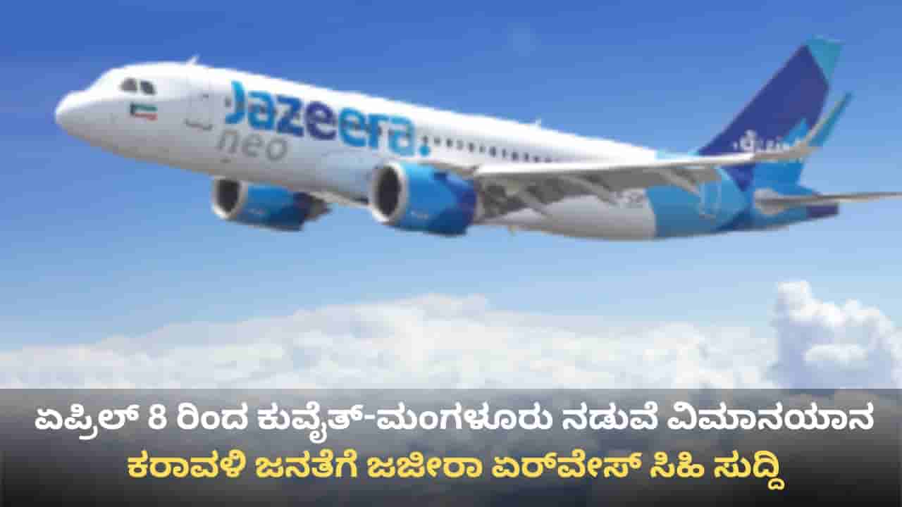 ಮಂಗಳೂರು, ಏಪ್ರಿಲ್ 2: ಮಧ್ಯಪ್ರಾಚ್ಯ ರಾಷ್ಟ್ರಗಳಲ್ಲಿ ಉದ್ಯೋಗದಲ್ಲಿರುವ ದಕ್ಷಿಣ ಭಾರತದ ಪ್ರಯಾಣಿಕರಿಗೆ, ಅದರಲ್ಲೂ ವಿಶೇಷವಾಗಿ ಕರಾವಳಿ ಭಾಗದ ಜನರಿಗೆ ಜಜೀರಾ ಏರ್ವೇಸ್ (Jazeera Airways) ಭರ್ಜರಿ ಸಿಹಿ ಸುದ್ದಿ ನೀಡಿದೆ. ಏಪ್ರಿಲ್ 8ರಿಂದ ಸೌದಿ ಅರೇಬಿಯಾದ ದಮ್ಮಮ್ ಮೂಲಕ ಕುವೈತ್ ಮತ್ತು ಮಂಗಳೂರು (Mangalore) ನಡುವೆ ವಾರಕ್ಕೆ ಎರಡು ಬಾರಿ ವಿಶೇಷ ವಿಮಾನಯಾನ ಸೇವೆ ಆರಂಭವಾಗಲಿದೆ.