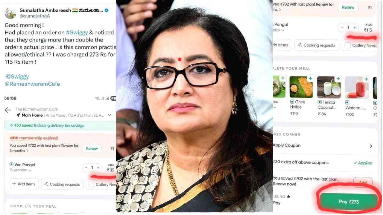 ಸುಮಲತಾ ಅಂಬರೀಶ್ ಅವರು ರಾಮೇಶ್ವರಂ ಕೆಫೆಯಿಂದ ಪೊಂಗಲ್ ಆರ್ಡರ್ ಮಾಡಿದ್ದರು. ಆರ್ಡರ್ ಮಾಡಿದ ಆಹಾರದ ಮೂಲ ಬೆಲೆ 115 ರೂಪಾಯಿ ಮಾತ್ರವಾಗಿದ್ದರೂ, ಸ್ವಿಗ್ಗಿ ಐಟಂ ಹಾಗೂ ಇತರೆ ಶುಲ್ಕ ಸೇರಿಸಿ ಒಟ್ಟು 273 ರೂ. ವಸೂಲಿ ಮಾಡಿದೆ. ಅಂದರೆ ಮೂಲ 115 ರೂಪಾಯಿಯ ಪೊಂಗಲ್ಗೆ 158 ರೂ. ಶುಲ್ಕ ವಿಧಿಸಲಾಗಿದೆ. ಇದರಿಂದ ಆಹಾರದ ಬೆಲೆಯಿಗಿಂತಲೂ ಹೆಚ್ಚು ಮೊತ್ತವನ್ನು ಡೆಲಿವರಿ ಹಾಗೂ ಇತರೆ ಶುಲ್ಕಗಳ ಹೆಸರಿನಲ್ಲಿ ಪಡೆಯಲಾಗುತ್ತಿದೆ ಎಂದು ಆಕ್ರೋಶ ವ್ಯಕ್ತಪಸಿದ್ದಾರೆ.