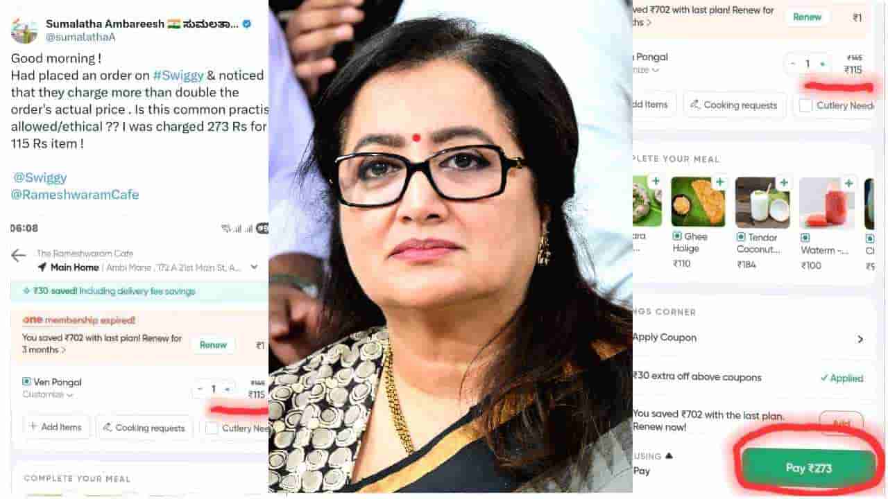 ಸುಮಲತಾ ಅಂಬರೀಶ್ ಅವರು ರಾಮೇಶ್ವರಂ ಕೆಫೆಯಿಂದ ಪೊಂಗಲ್ ಆರ್ಡರ್ ಮಾಡಿದ್ದರು. ಆರ್ಡರ್ ಮಾಡಿದ ಆಹಾರದ ಮೂಲ ಬೆಲೆ 115 ರೂಪಾಯಿ ಮಾತ್ರವಾಗಿದ್ದರೂ, ಸ್ವಿಗ್ಗಿ ಐಟಂ ಹಾಗೂ ಇತರೆ ಶುಲ್ಕ ಸೇರಿಸಿ ಒಟ್ಟು 273 ರೂ. ವಸೂಲಿ ಮಾಡಿದೆ. ಅಂದರೆ ಮೂಲ 115 ರೂಪಾಯಿಯ ಪೊಂಗಲ್ಗೆ 158 ರೂ. ಶುಲ್ಕ ವಿಧಿಸಲಾಗಿದೆ. ಇದರಿಂದ ಆಹಾರದ ಬೆಲೆಯಿಗಿಂತಲೂ ಹೆಚ್ಚು ಮೊತ್ತವನ್ನು ಡೆಲಿವರಿ ಹಾಗೂ ಇತರೆ ಶುಲ್ಕಗಳ ಹೆಸರಿನಲ್ಲಿ ಪಡೆಯಲಾಗುತ್ತಿದೆ ಎಂದು ಆಕ್ರೋಶ ವ್ಯಕ್ತಪಸಿದ್ದಾರೆ.