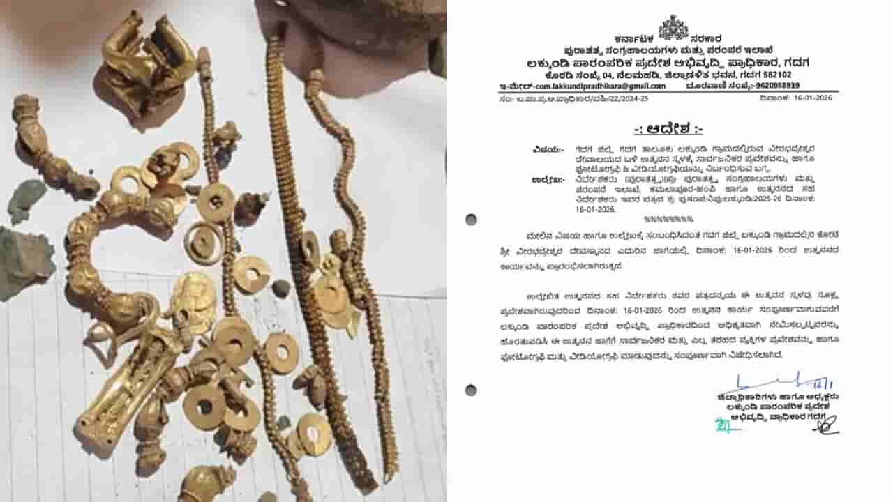 ಗದಗ, ಜನವರಿ 17: ಲಕ್ಕುಂಡಿಯಲ್ಲಿ ಒಂದು ಕುಟುಂಬಕ್ಕೆ ಇತ್ತೀಚಿಗಷ್ಟೆ ಕೋಟ್ಯಂತರ ರೂ. ಬೆಲೆ ಬಾಳುವ ಚಿನ್ನ (Gold Tressure) ಸಿಕ್ಕಿತ್ತು. ಈ ಹಿನ್ನೆಲೆ ಐತಿಹಾಸಿಕ ಲಕ್ಕುಂಡಿ ಗ್ರಾಮದಲ್ಲಿರುವ ಕೋಟೆ ಶ್ರೀ ವೀರಭದ್ರೇಶ್ವರ ದೇವಸ್ಥಾನದ ಎದುರಿನ ಉತ್ಖನನ ಸ್ಥಳವನ್ನು ನಿರ್ಬಂಧಿತ ಪ್ರದೇಶ ಎಂದು ಘೋಷಿಸಲಾಗಿದೆ. ಈ ಸಂಬಂಧ ಗದಗ ಜಿಲ್ಲಾಧಿಕಾರಿ ಹಾಗೂ ಲಕ್ಕುಂಡಿ ಪಾರಂಪರಿಕ ಪ್ರದೇಶ ಅಭಿವೃದ್ಧಿ ಪ್ರಾಧಿಕಾರದ ಅಧ್ಯಕ್ಷರಾದ ಸಿ.ಎನ್. ಶ್ರೀಧರ್ ಆದೇಶ ಹೊರಡಿಸಿದ್ದಾರೆ.