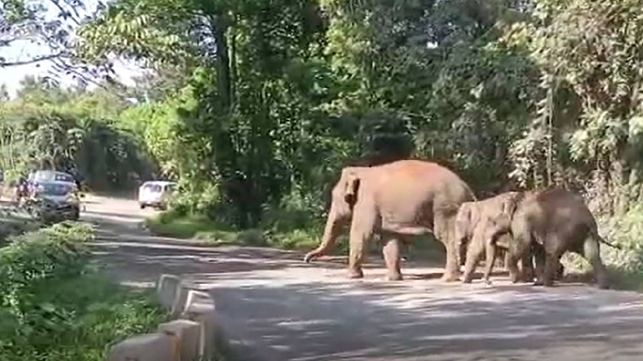 ರಾಷ್ಟ್ರೀಯ ಹೆದ್ದಾರಿಗೆ ಲಗ್ಗೆ ಇಟ್ಟ ಗಜಪಡೆ, ಕೂದಲೆಳೆ ಅಂತರದಲ್ಲಿ ವಾಹನ ಸವಾರರು ಪಾರು!