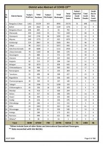 ಬೇರೆ ಜಿಲ್ಲೆಗಳಲ್ಲಿ ಇಂದು ಸೋಂಕಿತರ ಸಂಖ್ಯೆ ಎಷ್ಟು? ಇನ್ನು ಇತರೆ ಜಿಲ್ಲೆಗಳ ಅಂಕಿ ಅಂಶಗಳನ್ನ ನೋಡಿದರೆ ಬಳ್ಳಾರಿಯಲ್ಲಿ 193 ಕೇಸ್, ದಕ್ಷಿಣ ಕನ್ನಡದಲ್ಲಿ 149,ಮೈಸೂರಲ್ಲಿ 135, ಯಾದಗಿರಿಯಲ್ಲಿ 117 ಪ್ರಕರಣಗಳು ವರದಿಯಾಗಿದೆ. ಉತ್ತರ ಕನ್ನಡದಲ್ಲಿ 109 ಕೇಸ್ ಹಾಸನದಲ್ಲಿ 107, ಕೋಲಾರದಲ್ಲಿ 103 ಹಾಗೂ ಕಲಬುರಗಿ 99 ಪ್ರಕರಣಗಳು ಪತ್ತೆಯಾಗಿದೆ. ದಾವಣಗೆರೆ ಹಾಗೂ ಬೆಂಗಳೂರು ಗ್ರಾಮಾಂತರ ತಲಾ 95 ಕೇಸ್, ಉಡುಪಿ, ಧಾರವಾಡದಲ್ಲಿ ತಲಾ 84 ಪ್ರಕರಣಗಳು ವರದಿಯಾಗಿದೆ. ಚಿಕ್ಕಬಳ್ಳಾಪುರದಲ್ಲಿ 81 ಕೇಸ್, ಚಿಕ್ಕಮಗಳೂರಲ್ಲಿ 68, ಬೀದರ್ನಲ್ಲಿ 66 ಮತ್ತು ಬಾಗಲಕೋಟೆಯಲ್ಲಿ 65 ಪ್ರಕರಣ ಪತ್ತೆಯಾಗಿದೆ. ತುಮಕೂರಲ್ಲಿ 47, ಕೊಪ್ಪಳದಲ್ಲಿ 45 ಹಾಗೂ ಹಾವೇರಿಯಲ್ಲಿ 39 ಪ್ರಕರಣ ವರದಿಯಾಗಿದೆ. ಚಾಮರಾಜನಗರದಲ್ಲಿ 34, ಬೆಳಗಾವಿ ಮತ್ತು ಚಿತ್ರದುರ್ಗದಲ್ಲಿ ತಲಾ 23 ಕೇಸ್ಗಳು ಪತ್ತೆಯಾಗಿದೆ. ಶಿವಮೊಗ್ಗದಲ್ಲಿ 20, ಗದಗದಲ್ಲಿ 15 ಮತ್ತು ವಿಜಯಪುರದಲ್ಲಿ 13 ಪ್ರಕರಣಗಳು ಪತ್ತೆಯಾಗಿದೆ. ಮಂಡ್ಯದಲ್ಲಿ 13, ರಾಮನಗರದಲ್ಲಿ 8, ರಾಯಚೂರಿನಲ್ಲಿ 4 ಮತ್ತು ಕೊಡಗಿನಲ್ಲಿ 1 ಕೇಸ್ ಪತ್ತೆಯಾಗಿದೆ ಎಂದು ಆರೋಗ್ಯ ಮತ್ತು ಕುಟುಂಬ ಕಲ್ಯಾಣ ಇಲಾಖೆ ಮಾಹಿತಿ ನೀಡಿದೆ.
