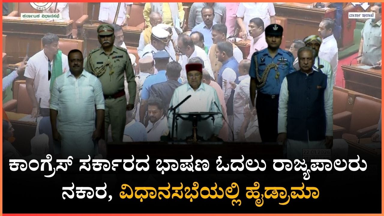 ಬೆಂಗಳೂರು, ಜನವರಿ 22: ನರೇಗಾ (NREGA) ಯೋಜನೆ ಹೆಸರನ್ನು ಕೇಂದ್ರ ಸರ್ಕಾರ ಬದಲಾಯಿಸಿರುವುದರ ವಿರುದ್ಧ ಕರ್ನಾಟಕ ಸರ್ಕಾರ ಕರೆದಿರುವ ವಿಶೇಷ ಅಧಿವೇಶನ (Karnataka Assembly Special Session) ಕೂಡ ರಾಜ್ಯಪಾಲರು (Karnataka Governor) ಮತ್ತು ಸರ್ಕಾರದ ವಿರುದ್ಧದ ಸಂಘರ್ಷಕ್ಕೆ ಕಾರಣವಾಗಿದೆ. ಅಧಿವೇಶನ ಉದ್ದೇಶಿಸಿ ಮಾತನಾಡಲು ರಾಜ್ಯಪಾಲ ಥಾವರ್ಚಂದ್ ಗೆಹ್ಲೋಟ್ ವಿಧಾನಸಭೆಗೆ ಬರುತ್ತಾರೆಯೇ ಎಂಬ ಅನುಮಾನವಿತ್ತು. ಆದರೆ, ಇದನ್ನು ಹುಸಿ ಮಾಡಿದ ರಾಜ್ಯಪಾಲರು, ಕೇವಲ ಒಂದೆರಡು ವಾಕ್ಯಗಳಲ್ಲಿ ಮಾತನಾಡಿ ಶುಭಾಶಯ ತಿಳಿಸಿ ಸರ್ಕಾರ ಕೊಟ್ಟ ಭಾಷಣದ ಪ್ರತಿ ಪೂರ್ತಿ ಓದದೆ ತೆರಳಿದರು. ಇದಕ್ಕೆ ಆಡಳಿತ ಪಕ್ಷದ ಶಾಸಕರು ತೀವ್ರ ವಿರೋಧ ವ್ಯಕ್ತಪಡಿಸಿ ಘೋಷಣೆಗಳನ್ನು ಕೂಗಿದರು. ಈ ಸಂದರ್ಭದಲ್ಲಿ ವಿಧಾನಸಭೆ ಹೈಡ್ರಾಮಾಕ್ಕೆ ಸಾಕ್ಷಿಯಾಯಿತು.