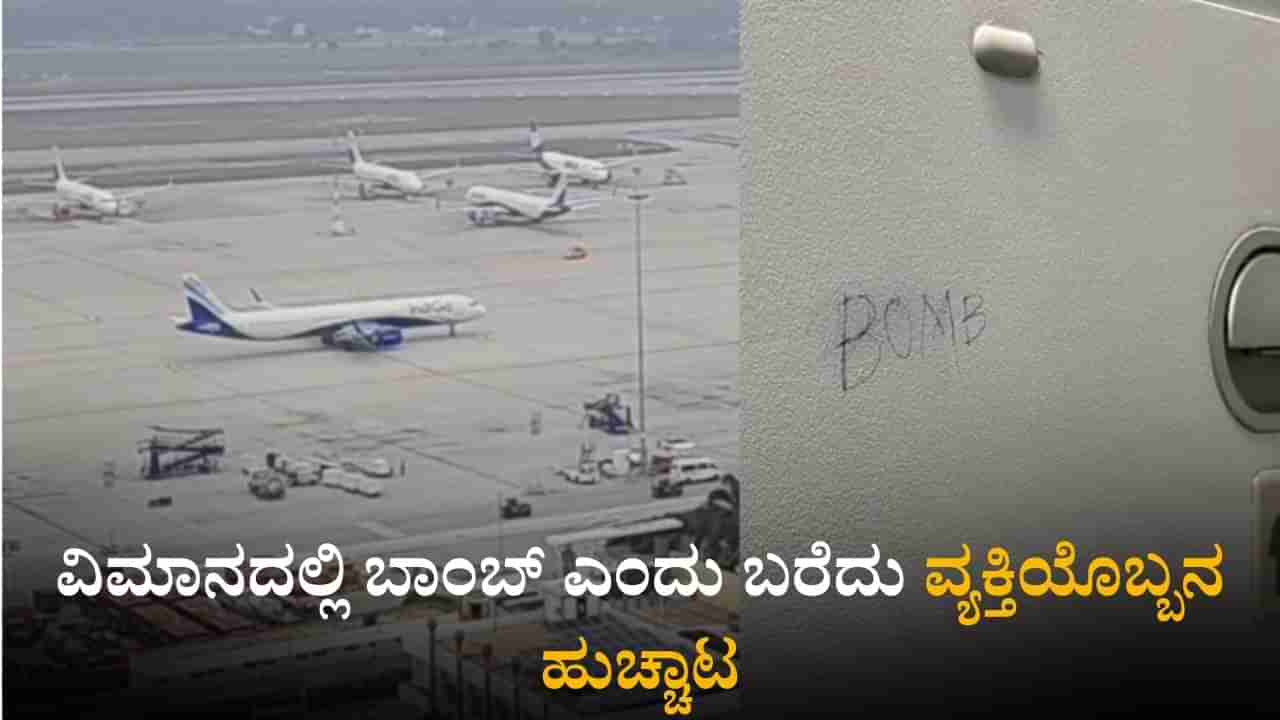 ಬೆಂಗಳೂರು, ಅಕ್ಟೋಬರ್ 19: ದುಬೈನಿಂದ ಮಂಗಳೂರಿಗೆ ಪ್ರಯಾಣಿಸುತ್ತಿದ್ದ ಇಂಡಿಗೋ ವಿಮಾನ (ಸಂಖ್ಯೆ 6E4814) ನಲ್ಲಿ (Indigo Flight) ನಡೆದ ಘಟನೆಯೊಂದು ಪ್ರಯಾಣಿಕರ ಆತಂಕಕ್ಕೆ ಎಡೆಮಾಡಿತ್ತು. ಶನಿವಾರ (ಅ.18) ಮಧ್ಯರಾತ್ರಿ ನಡೆದ ಘಟನೆಯಲ್ಲಿ, ಒಬ್ಬ ಪ್ರಯಾಣಿಕನು ವಿಮಾನದ ಬಾತ್ ರೂಮ್ನಲ್ಲಿ ‘ಬಾಂಬ್’ (Bomb) ಎಂದು ಪೆನ್ನಿಂದ ಬರೆದಿದ್ದಾನೆ. ಈ ಬರಹವನ್ನು ನೋಡಿರುವ ವಿಮಾನ ಪ್ರಯಾಣಿಕರಲ್ಲಿ ಆತಂಕದ ವಾತಾವರಣ ನಿರ್ಮಾಣವಾಗಿತ್ತು. ನಂತರ ಪರಿಶೀಲನೆ ಬಳಿಕ ಆತಂಕ ಪಡುವ ಸಂಗತಿಯಿಲ್ಲವೆಂದು ತಿಳಿದ ಪ್ರಯಾಣಿಕರು ಮತ್ತು ಸಿಬ್ಬಂದಿ ನಿಟ್ಟುಸಿರು ಬಿಟ್ಟರು.