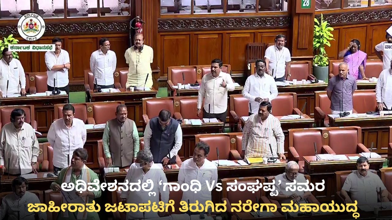 ಕಾಂಗ್ರೆಸ್ ಸರ್ಕಾರ ಮಹಾತ್ಮ ಗಾಂಧೀಜಿ ಹಾಗೂ ‘ಸಂಘಪ್ಪ’ ಎಂಬ ವ್ಯಕ್ತಿಯ ಚಿತ್ರದೊಂದಿಗೆ ನರೇಗಾ ಜಾಹೀರಾತು ನೀಡಿರುವ ವಿಚಾರವಾಗಿ ವಿಧಾನಸಭೆಯಲ್ಲಿ ಭಾರಿ ವಾಕ್ಸಮರ ನಡೆದಿದೆ. ಬಿಜೆಪಿ ನಿಯಮ ಉಲ್ಲಂಘನೆ ಆರೋಪಿಸಿದರೆ, ಕಾಂಗ್ರೆಸ್ ತೀವ್ರ ತಿರುಗೇಟು ನೀಡಿದೆ. ಜಾಹೀರಾತು ರಾಜಕೀಯ ಸಂಘರ್ಷಕ್ಕೆ ಕಾರಣವಾಗಿದೆ. ಆ ಕುರಿತ ವಿವರ ಇಲ್ಲಿದೆ.