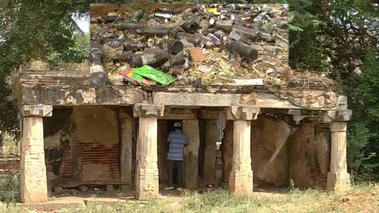 ಈ ಪುರಾತನ ಶಿವ ದೇವಾಲಯವನ್ನು ಮೈಸೂರು ಮಹಾರಾಜರು ಕಟ್ಟಿಸಿದ್ದರು. ಆದ್ರೆ, ಯಾವುದೇ ಮೂಲಸೌಕರ್ಯಗಳಿಲ್ಲದೇ ದೇವಾಲಯ ಪಾಳು ಬಿದ್ದಿದೆ. ಹೀಗಾಗಿ ಇದನ್ನು ಪುಂಡ ಪೋಕರಿಗಳು ತಮ್ಮ ಅಡ್ಡೆಯಾಗಿ ಮಾಡಿಕೊಂಡಿದ್ದಾರೆ.ಮೀಸೆ ಚಿಗುರುವ ಮುನ್ನವೇ ಮದ್ಯದ ದಾಸರಾಗಿರುವ ಪಡ್ಡೆ ಹುಡುಗರು ಪೊಲೀಸರ ಭಯವಿಲ್ಲದೇ, ಶಿವಲಿಂಗದ ಮೇಲೆ ಮದ್ಯವಿಟ್ಟು ಸೇವಿಸುತ್ತಿದ್ದಾರೆ. ಇದೀಗ ಮಟ ಮಟ ಮದ್ಯಾಹ್ನವೇ ಕಂಠಪೂರ್ತಿ ಕುಡಿದು ಬೀದಿಗಳಲ್ಲಿ ಅಲೆಯುತ್ತಿದ್ದಾರೆ.