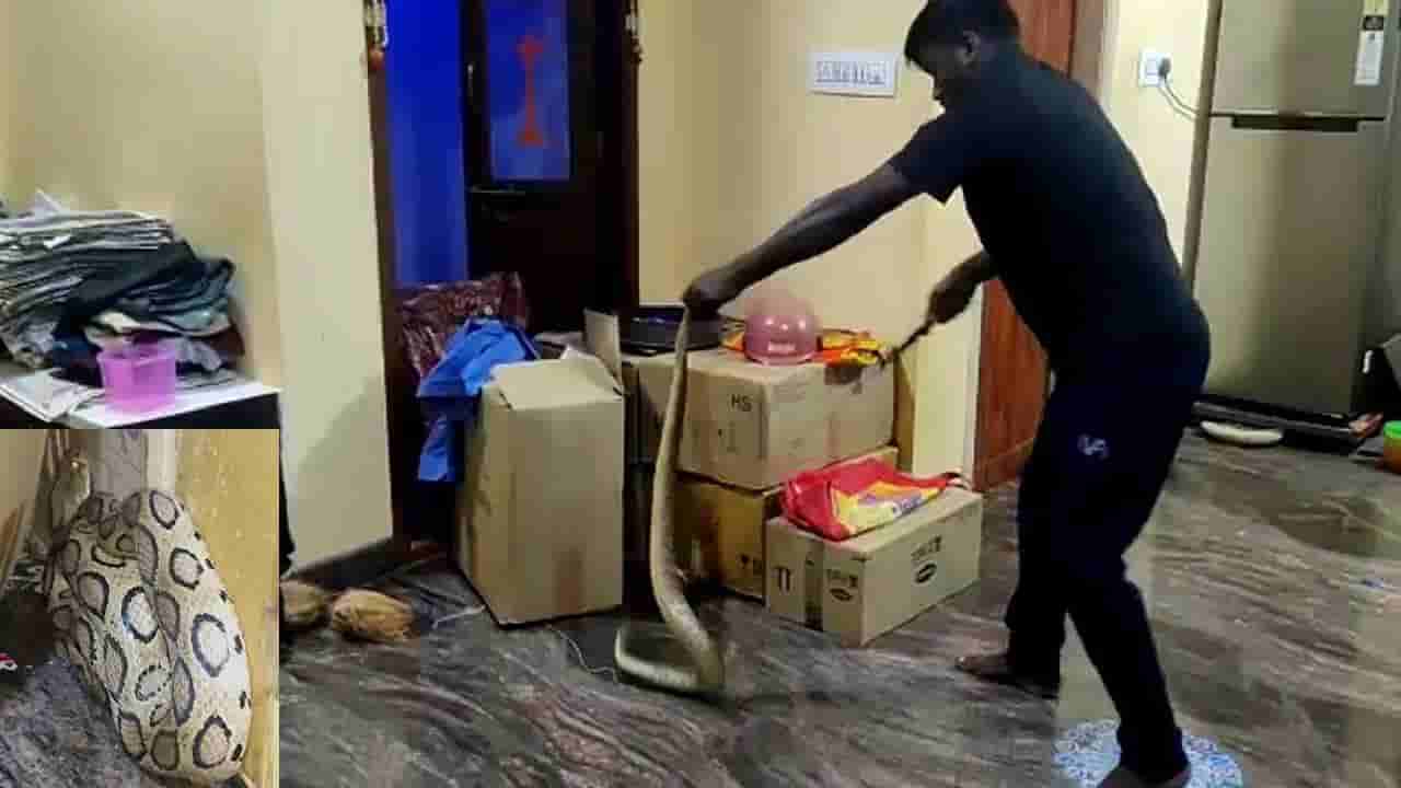 ತುಮಕೂರು: ಜಿಲ್ಲಾದ್ಯಂತ ಉತ್ತಮ ಮಳೆಯಾಗಿದೆ. ಮಳೆಯಿಂದ ಕೆರೆ, ಕುಂಟೆ, ಹಳ್ಳ, ನದಿ, ಜಲಾಶಯಗಳು ತುಂಬಿ ಹರಿಯುತ್ತಿವೆ. ಇದರಿಂದ ರೈತರು ಒಂದು ಕಡೆ ಖುಷಿಯಾದರೇ ಮತ್ತೊಂದು ಕಡೆ ಮನೆಗಳಿಗೆ ಹಾವುಗಳು (Snakes) ನುಗ್ಗುತ್ತಿದ್ದು ಇದರಿಂದ ಜನರು ಭಯಬೀತರಾಗಿದ್ದಾರೆ. ಮನೆಗಳ ಕಾಂಪೌಂಡ್ಗಳಲ್ಲಿ, ಗೋಡೆಗಳಲ್ಲಿ, ಮನೆಗಳ ಒಳಗಡೆ ಅದರಲ್ಲೂ ದೇವರ ಮನೆಯಲ್ಲಿ ಹಾವುಗಳು ಪ್ರತ್ಯಕ್ಷವಾಗುತ್ತಿದ್ದು, ಇದರಿಂದ ಜನರು ತೀವ್ರ ಭಯಬೀತರಾಗಿದ್ದಾರೆ. ಸದ್ಯ ತುಮಕೂರು ಹೊರವಲಯದ ಶಿರಾ ಗೇಟ್ ಬಳಿಯಿರುವ ಗೋಪಾಲಕೃಷ್ಣ ರವರ ಮನೆಯಲ್ಲಿ ಐದು ಅಡಿ ಉದ್ದದ ಕೊಳಕು ಮಂಡಲ ಹಾವೊಂದು ಪ್ರತ್ಯಕ್ಷವಾಗಿದೆ.
