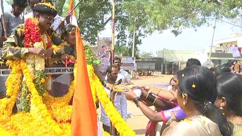 ( Villagers threw a lavish welcome to the soldier who served for the country for 35 years in Devanahalli Bangaluru)