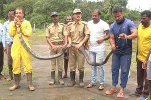 ಚಿಕ್ಕಮಗಳೂರು: ಜಿಲ್ಲೆಯ ಮೂಡಿಗೆರೆ ತಾಲೂಕಿನ ಕೆಳಗೂರಿನಲ್ಲಿ 13 ಅಡಿ ಉದ್ದದ ಕಾಳಿಂಗ ಸರ್ಪವ ಒಂದನ್ನು ರಕ್ಷಿಸಿ ಕಾಡಿನಲ್ಲಿ ಬಿಡುಗಡೆ ಮಾಡಲಾಗಿದೆ.