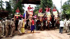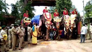 ಕ್ಯಾಪ್ಟನ್ ಅಭಿಮನ್ಯು ಸೇರಿದಂತೆ ಗಜಪಡೆಗೆ ಅಷ್ಟಗಂಧ, ಅರಶಿನ ಮತ್ತು ಕುಂಕುಮ ಹಚ್ಚಿದ ಬಳಿಕ ಪುಷ್ಪಾರ್ಚನೆ ಮಾಡಿ ಗಜಪಯಣಕ್ಕೆ ಚಾಲನೆ ನೀಡಲಾಯಿತು.