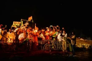 ನದಿ ತೀರದಲ್ಲಿ ದೀಪಗಳ ಬೆಳಕಿನ ಕಲರವ.. ಹೌದು ಪವಿತ್ರ ತುಂಗಾಭದ್ರ ನದಿಯ ದಡದಲ್ಲಿ ಎಲ್ಲಿ ನೋಡಿದರಲ್ಲಿಯೂ ದೀಪಗಳ ಸಾಲು ಸಾಲು… ಬೆಳಕಿನ ವೈಭವ. ನದಿಯಲ್ಲಿ ಬಂಡೆಗಳ ಮೇಲೂ ಉರಿದ ಹಣತೆ, ನದಿಗೆ ಬಾಗಿನ ಸಮರ್ಪಣೆ. ಇದು ಹಂಪಿ ಉತ್ಸವದ ನಿಮಿತ್ತ ವಿರೂಪಾಕ್ಷೇಶ್ವರ ದೇವಸ್ಥಾನದ ಪಕ್ಕದಲ್ಲಿರುವ ತುಂಗಾಭದ್ರ ನದಿ ದಡದಲ್ಲಿ ನಡೆದ ತುಂಗಾರತಿ ಮಹೋತ್ಸದಲ್ಲಿ ಕಂಡುಬಂದ ದೃಶ್ಯಗಳು. ಈ ತುಂಗಾರತಿ ಮಹೋತ್ಸವವು ಜನಮನಸೂರೆಗೊಂಡಿತು.