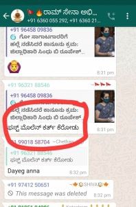 ಅಲ್ಲದೆ ಜಾನುವಾರು ಸಾಗಾಟ ಮಾಡುವ ವಾಹನದ ಹಾಗೂ ಜನರ ಮೇಲೆ ಹಲ್ಲೆ ನಡೆಸಿದರೆ ಅವರ ವಿರುದ್ಧ ಕಾನೂನು ಕ್ರಮ ತೆಗೆದುಕೊಳ್ಳಲಾಗುತ್ತದೆ ಎಂದೂ ಎಚ್ಚರಿಸಿದ್ದರು. ಹೀಗಾಗಿ ಜಿಲ್ಲಾಧಿಕಾರಿಯವರ ಹೇಳಿಕೆಯ ಸುದ್ದಿಯನ್ನು ಉಲ್ಲೇಖಿಸಿ ವಾಟ್ಸಾಪ್ ಗ್ರೂಪಲ್ಲಿ ಚರ್ಚೆಯಾಗಿದೆ. ಈ ವೇಳೆ ತುಳುವಿನಲ್ಲಿ ಹತ್ಯೆಯ ಬೆದರಿಕೆ ಹಾಕಿದ್ದಾರೆ.