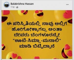 ಈ ಪರಿಸ್ಥಿತಿಯಲ್ಲಿ ನಾವು ಅಲ್ಲಿಗೆ ಹೋಗೋಕ್ಕೆ ಆಗೋಲ್ಲ ಅಂತಾ ದೇವರು ಬೆಂಗಳೂರನ್ನೇ ಊಟಿ-ಸಿಮ್ಲಾ-ಮನಾಲಿ ಮಾಡಿಬಿಟ್ಟಿದ್ದಾನೆ ಎಂದು ಹಸನ್ಮುಖರಾಗಿದ್ದಾರೆ.