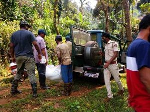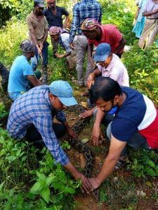 ಕಾಫಿ ತೋಟದಲ್ಲಿ ಬೇಟೆಗಾಗಿ ಹೊಂಚು ಹಾಕಿ ಮಲಗಿದ್ದ ಬೃಹತ್ ಗಾತ್ರದ ಹೆಬ್ಬಾವು ಸೆರೆ