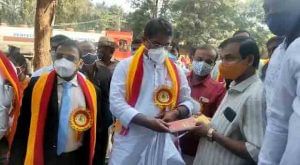 ರಾಜ್ಯೋತ್ಸವದಂದು ಸಚಿವರ ವಿನೂತನ ಪ್ರಯತ್ನ: ಜೋಳಿಗೆ ಹಾಕಿಕೊಂಡು ಕನ್ನಡ ಪುಸ್ತಕಗಳ ಮಾರಾಟ