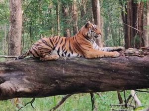 ಕಾಡಿನ ಸ್ವಚ್ಛಂದ ವಾತಾವರಣಲ್ಲಿ ಮರದ ಮೇಲೆ ಪ್ರಶಾಂತವಾಗಿ ಕೂತಿದ್ದ ವ್ಯಾಘ್ರನ ಕಂಡು ಪ್ರವಾಸಿಗರು ಫುಲ್ ಫಿದಾ ಆಗಿದ್ದಾರೆ. ಪ್ರವಾಸಿಗರ ಕ್ಯಾಮರಾದಲ್ಲಿ ಸೆರೆಸಿಕ್ಕ ಹುಲಿರಾಯನ ಆ ಗತ್ತು, ಆ ಗಾಂಭೀರ್ಯ ನಿಮ್ಮ ಕಣ್ಮನ ಸೆಳೆಯುವುದಂತೂ ಗ್ಯಾರಂಟಿ. ಸುಮಾರು 30 ನಿಮಿಷಗಳ ಕಾಲ ಮರದ ಮೇಲೆ ರಿಲಾಕ್ಸ್ ಆಗಿ ಕೂತ ಹುಲಿರಾಯ ಪ್ರವಾಸಿಗರ ಕ್ಯಾಮರಾಗೆ ಸಖತ್ ಪೋಸ್ ಸಹ ಕೊಟ್ಟಿದ್ದಾನೆ.