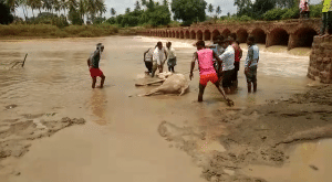 ಗದಗ ಜಿಲ್ಲೆಯ ನರಗುಂದ ತಾಲೂಕಿನ ಕೊಣ್ಣೂರ ಹಳೇ ಸೇತುವೆ ಬಳಿ ಈ ಘಟನೆ ನಡೆದಿದ್ದು, ಗೋವನಕೊಪ್ಪ ಗ್ರಾಮದ ರೈತ ನಿಂಗಪ್ಪ ಹಿರಿಗಣ್ಣನವರು ತಮ್ಮ ಎತ್ತುಗಳ ಮೈತೊಳೆಯಲು ನದಿಗೆ ಇಳಿದಿದ್ದಾರೆ. ಇತ್ತೀಚೆಗೆ ಮಲಪ್ರಭಾ ನದಿ ಉಕ್ಕಿ ಹರಿದ ಪರಿಣಾಮ ಮಣ್ಣು ಮಿಶ್ರಿತ ಮರಳು ಹೆಚ್ಚಿನ ಪ್ರಮಾಣದಲ್ಲಿ ಶೇಖರಣೆ ಆಗಿರುವುದರಿಂದ ಎತ್ತುಗಳು ಕೆಸರಲ್ಲಿ ಸಿಲುಕಿಕೊಂಡಿವೆ.