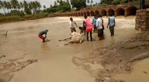 ಮಲಪ್ರಭಾ ನದಿ ಕೆಸರಿನಲ್ಲಿ ಸಿಲುಕಿ 2 ಎತ್ತುಗಳ ನರಳಾಟ