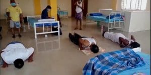 ಬಳ್ಳಾರಿ: ಕೊರೊನಾ ಸೊಂಕಿತರಾಗಿ ಬಳ್ಳಾರಿಯ ವಿಮ್ಸ್ ಸರಕಾರಿ ದಂತ ಮಹಾವಿದ್ಯಾಲಯದಲ್ಲಿ 8 ದಿನಗಳ ಹಿಂದೆ ದಾಖಲಾಗಿರುವ ಬಳ್ಳಾರಿ ಜಿಲ್ಲೆ ಕಂಪ್ಲಿ ಪುರಸಭೆಯ ಸದಸ್ಯ ಚಾಂದ್ ಪಾಶಾ ಸೊಂಕಿತರಿಗೆ ಯೋಗಾಸನದ ವಿವಿಧ ಭಂಗಿಗಳು ಹಾಗೂ ಸೂರ್ಯ ನಮಸ್ಕಾರಗಳನ್ನು ಕಲಿಸುವುದರ ಜತೆಗೆ ನೈತಿಕ ಸ್ಥೈರ್ಯ ತುಂಬುವುದರ ಮೂಲಕ ಗಮನ ಸೆಳೆಯುತ್ತಿದ್ದಾರೆ.