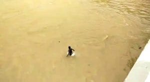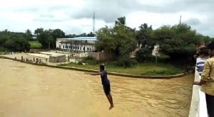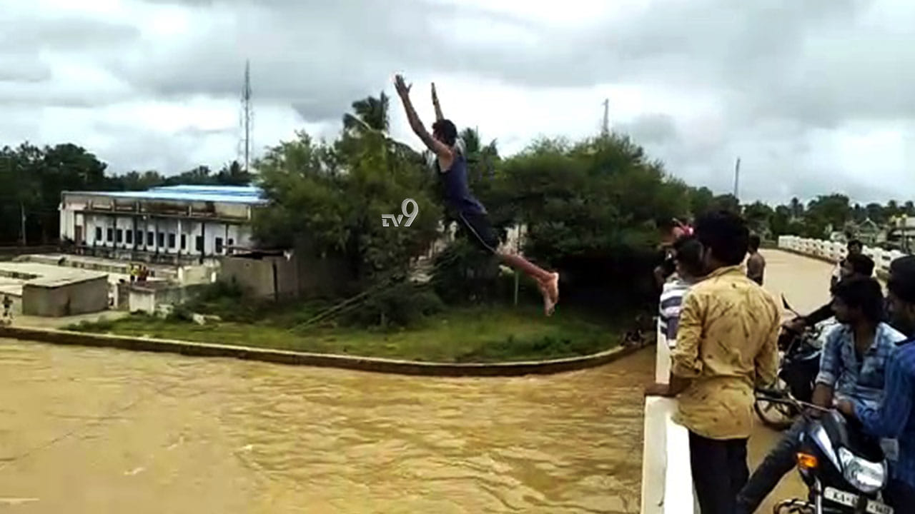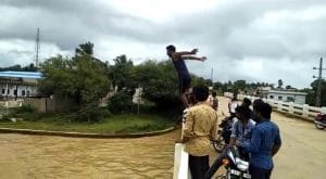 ತುಂಬಿ ಹರಿಯುತ್ತಿರೋ ನದಿಯಲ್ಲಿ ಬ್ರಿಡ್ಜ್ ಮೇಲಿಂದ ಜಿಗಿದು ಯುವಕರ ಹುಚ್ಟಾಟ