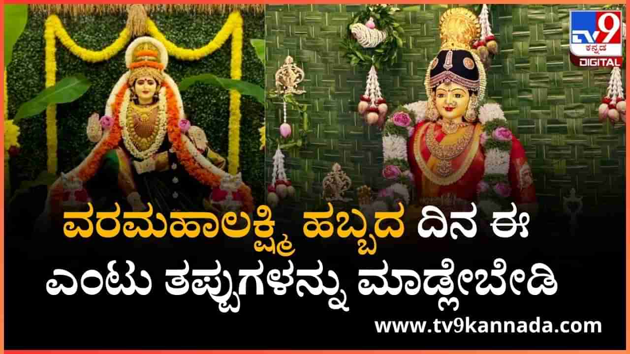 ಹಿಂದೂ ಧರ್ಮದ ಪ್ರಕಾರವಾಗಿ ಸಂಪತ್ತಿನ ದೇವತೆಯಾಗಿ ಲಕ್ಷ್ಮಿದೇವಿಯನ್ನು ಆರಾಧಿಸಲಾಗುತ್ತದೆ. ಹೀಗಾಗಿ ವರಮಹಾಲಕ್ಷ್ಮಿ ವ್ರತ (Varamahalakshmi Vrata)ಆಚರಣೆಗೆ ವಿಶೇಷ ಮಹತ್ವವನ್ನು ನೀಡಲಾಗಿದ್ದು, ಶ್ರಾವಣ ಮಾಸದಲ್ಲಿ ಶುಕ್ಲ ಪಕ್ಷದ ಶುಕ್ರವಾರದಂದು ಆಚರಿಸಲಾಗುವುದು ವಾಡಿಕೆ. ಆದರೆ ಈ ವರ್ಷ ಆಗಸ್ಟ್ 8ರಂದು ವರಮಹಾಲಕ್ಷ್ಮಿ ಹಬ್ಬವನ್ನು ಆಚರಿಸಲಾಗುತ್ತಿದೆ. ಸುಮಂಗಲಿಯರು ಬಹಳ ಶ್ರದ್ಧಾ ಭಕ್ತಿಯಿಂದ ಮನೆಯಲ್ಲಿ ವರಮಹಾಲಕ್ಷ್ಮಿಯನ್ನು ಕೂರಿಸಿ ಶಾಸ್ತ್ರಬದ್ಧವಾಗಿ ಪೂಜಿಸುತ್ತಾರೆ. ಆದರೆ ಈ ವರಮಹಾಲಕ್ಷ್ಮಿ ಹಬ್ಬ ಅಥವಾ ವ್ರತದ ದಿನ ಈ ತಪ್ಪುಗಳನ್ನು ಮಾಡಲೇಬಾರದು ಎನ್ನಲಾಗುತ್ತದೆ, ಆ ಕುರಿತಾದ ಮಾಹಿತಿ ಇಲ್ಲಿದೆ.