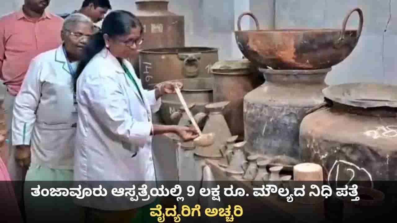 ತಂಜಾವೂರು, ಡಿಸೆಂಬರ್ 28: ತಂಜಾವೂರು ಸರ್ಕಾರಿ ವೈದ್ಯಕೀಯ ಕಾಲೇಜು ಆಸ್ಪತ್ರೆಯ ಹಿಂಭಾಗದ ಪಾಳು ಬಿದ್ದ ಕಟ್ಟಡದಲ್ಲಿ ನಿರ್ವಹಣಾ ಕಾರ್ಯದ ಸಮಯದಲ್ಲಿ ಅಪರೂಪದ ವಸ್ತುಗಳು ಪತ್ತೆಯಾಗಿವೆ. ಅಲ್ಲಿನ ಒಂದು ಕೋಣೆಯಲ್ಲಿ ತಾಮ್ರ ಮತ್ತು ಹಿತ್ತಾಳೆ ಪಾತ್ರೆಗಳು ಪತ್ತೆಯಾಗಿವೆ. ಪ್ರಾಥಮಿಕ ಸಂಶೋಧನೆಗಳ ಪ್ರಕಾರ, ಈ ಪಾತ್ರೆಗಳ ಮೌಲ್ಯ ರೂ. 9 ಲಕ್ಷ ಆಗಿರಬಹುದು. ತಂಜಾವೂರು (Thanjavur) ವೈದ್ಯಕೀಯ ಕಾಲೇಜು ಆಸ್ಪತ್ರೆಯ ಆವರಣದ ಹಳೆಯ ಕಟ್ಟಡ ಪ್ರದೇಶದಲ್ಲಿ ನಿರ್ವಹಣಾ ಕಾರ್ಯವನ್ನು ನಡೆಸಲಾಗುತ್ತಿತ್ತು. ಈ ವೇಳೆ ಈ ನಿಧಿ ಪತ್ತೆಯಾಗಿದೆ.