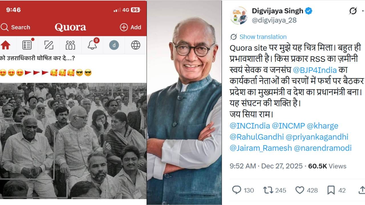ನರೇಂದ್ರ ಮೋದಿ ಅವರು ಗುಜರಾತ್ ಸಿಎಂ ಆಗುವುದಕ್ಕೂ ಮುನ್ನ ಸಾರ್ವಜನಿಕ ಸಮಾವೇಶವೊಂದರಲ್ಲಿ ಎಲ್ಕೆ ಆಡ್ವಾಣಿ ಮತ್ತಿತರ ಹಿರಿಯ ಮುಖಂಡರ ಮುಂದೆ ನೆಲದ ಮೇಲೆ ಕುಳಿತುಕೊಂಡಿರುವ ಒಂದು ಬ್ಲ್ಯಾಕ್ ಅಂಡ್ ವೈಟ್ ಚಿತ್ರವನ್ನು ದಿಗ್ವಿಜಯ ಸಿಂಗ್ ಅವರು ಎಕ್ಸ್ನಲ್ಲಿ ಹಂಚಿಕೊಂಡಿದ್ದಾರೆ. ಅವರು ಆ ಪೋಸ್ಟ್ನಲ್ಲಿ ಬರೆದಿರುವ ವಿಚಾರ ಈಗ ವೈರಲ್ ಆಗಿದೆ. ಆರೆಸ್ಸೆಸ್ ಮತ್ತು ಬಿಜೆಪಿ ಸಂಘಟನೆಗಳಲ್ಲಿ ತಳಮಟ್ಟದಲ್ಲಿರುವ ಕಾರ್ಯಕರ್ತರು ಹೇಗೆ ಮೇಲೆ ಬೆಳೆಯುತ್ತಾ ಹೋಗಿ ಮುಖ್ಯಮಂತ್ರಿ, ಮತ್ತು ಪ್ರಧಾನಿ ಮಂತ್ರಿಯೂ ಆಗಬಹುದು ಎಂಬುದನ್ನು ಈ ಚಿತ್ರ ತೋರಿಸುತ್ತದೆ. ಇದು ಸಂಘಟನೆಯ ಶಕ್ತಿ ಎಂದು ದಿಗ್ವಿಜಯ ಸಿಂಗ್ ಆ ಫೋಟೋಗೆ ವಿವರಣೆ ಕೊಟ್ಟಿದ್ದಾರೆ.