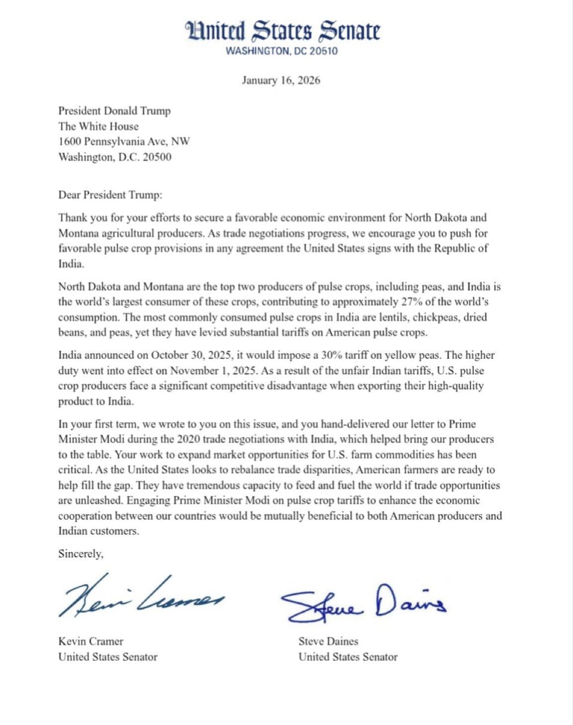 ಯುಎಸ್ ಅಧ್ಯಕ್ಷರಿಗೆ ಬರೆದ ಪತ್ರದಲ್ಲಿ, ಮೊಂಟಾನಾ ಮತ್ತು ಉತ್ತರ ಡಕೋಟಾ ದ್ವಿದಳ ಧಾನ್ಯಗಳ ಬೆಳೆಗಳ 2 ಪ್ರಮುಖ ಉತ್ಪಾದಕರು ಮತ್ತು ಭಾರತವು ವಿಶ್ವದ ಸೇವನೆಯ ಸುಮಾರು ಶೇ. 27ರಷ್ಟು ಅತಿದೊಡ್ಡ ಗ್ರಾಹಕ ಎಂದು ಸೆನೆಟರ್ಗಳು ತಿಳಿಸಿದ್ದಾರೆ. ಅಮೆರಿಕದಿಂದ ರಫ್ತು ಮಾಡುವ ಹಳದಿ ಬಟಾಣಿಗಳ ಮೇಲೆ ಭಾರತ ಶೇ. 30ರಷ್ಟು ಸುಂಕವನ್ನು ಘೋಷಿಸಿದೆ. ಈ ಸುಂಕಗಳು ನವೆಂಬರ್ 2025ರಲ್ಲಿ ಜಾರಿಗೆ ಬಂದಿವೆ. ಇದಕ್ಕೂ ಮೊದಲು ಹಳದಿ ಬಟಾಣಿಗಳನ್ನು ಸುಂಕ ರಹಿತವಾಗಿ ಭಾರತಕ್ಕೆ ರಫ್ತು ಮಾಡಲು ಅವಕಾಶವಿತ್ತು.