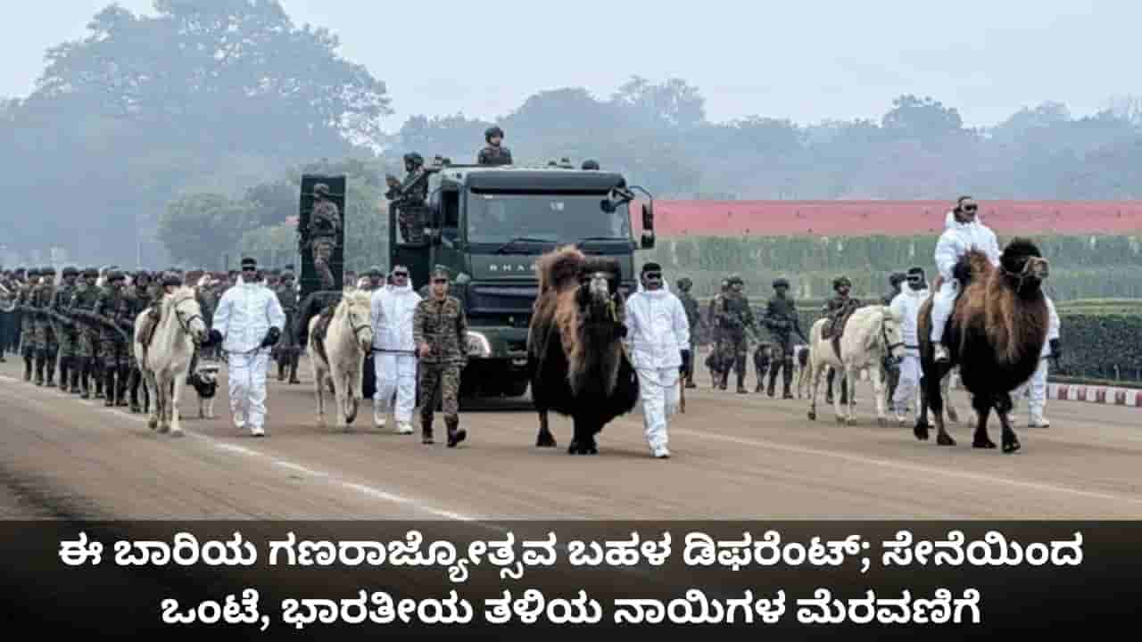 ನವದೆಹಲಿ, ಡಿಸೆಂಬರ್ 31: ಭಾರತವು 2026ರ ಗಣರಾಜ್ಯೋತ್ಸವದಂದು (Republic Day) ಅಪರೂಪದ ದೃಶ್ಯಕ್ಕೆ ಸಾಕ್ಷಿಯಾಗಲಿದೆ. ಈ ಬಾರಿ ಭಾರತೀಯ ಸೇನೆಯ ಪ್ರಾಣಿಗಳು ಕರ್ತವ್ಯ ಪಥದಲ್ಲಿ ಮೆರವಣಿಗೆ ನಡೆಸಲಿವೆ. ಇದು ಸಹಿಷ್ಣುತೆ, ತ್ಯಾಗ ಮತ್ತು ಸೈನ್ಯದ ವಿಶಿಷ್ಟವಾದ ಕಾರ್ಯಾಚರಣೆಯ ಸಾಮರ್ಥ್ಯವನ್ನು ಸಂಕೇತಿಸುತ್ತದೆ. ಇದೇ ಮೊದಲ ಬಾರಿಗೆ, ರಿಮೌಂಟ್ ಮತ್ತು ಪಶುವೈದ್ಯಕೀಯ ದಳದ ಕ್ಯುರೇಟೆಡ್ ಪ್ರಾಣಿ ತುಕಡಿಯು ಮೆರವಣಿಗೆಯಲ್ಲಿ ಭಾಗವಹಿಸುತ್ತದೆ. ಈ ತುಕಡಿಯು ಎರಡು ಬ್ಯಾಕ್ಟ್ರಿಯನ್ ಒಂಟೆಗಳು, 4 ಝನ್ಸ್ಕಾರ್ ಪೋನಿಗಳು, 4 ರಾಪ್ಟರ್ಗಳು, 10 ಭಾರತೀಯ ತಳಿಯ ಸೇನಾ ನಾಯಿಗಳು ಮತ್ತು ಈಗಾಗಲೇ ಸೇವೆಯಲ್ಲಿರುವ 6 ಸಾಂಪ್ರದಾಯಿಕ ಮಿಲಿಟರಿ ನಾಯಿಗಳನ್ನು ಒಳಗೊಂಡಿರುತ್ತದೆ.