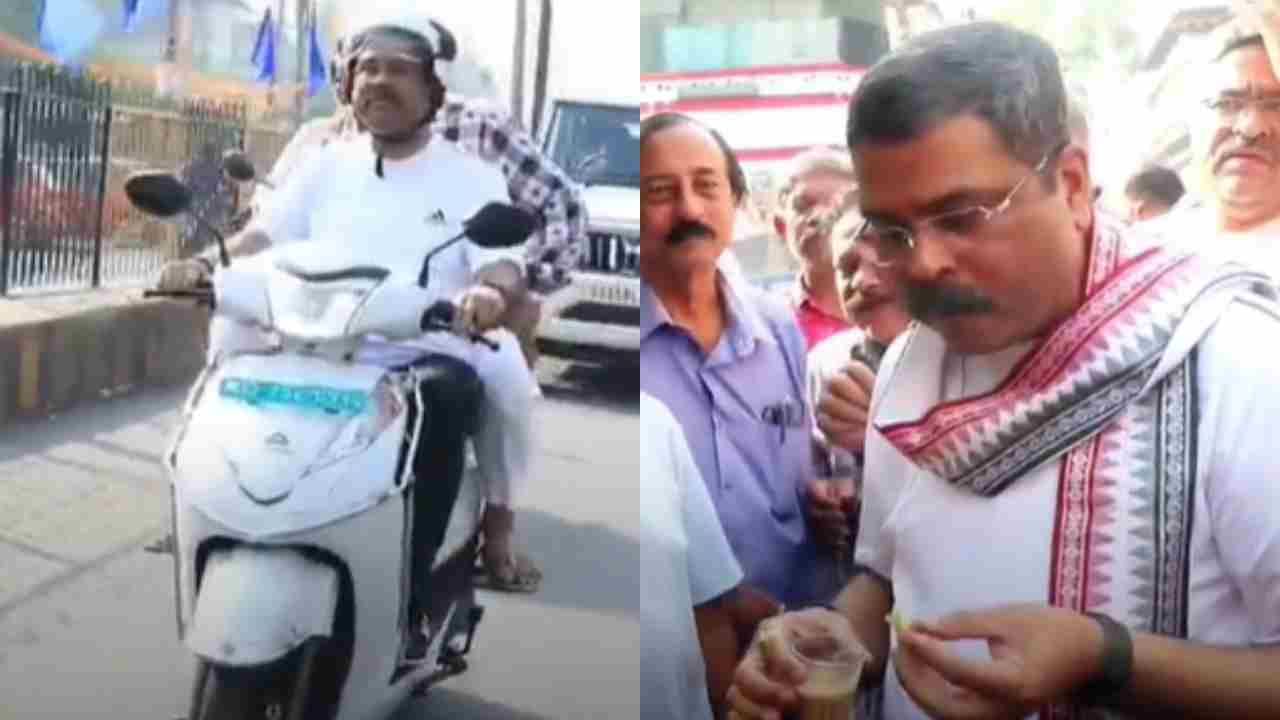 ಚುನಾವಣಾ ಪ್ರಚಾರ ವೇಳೆ ಬೈಕ್ ಸವಾರಿ, ಕಾರ್ಯಕರ್ತರೊಂದಿಗೆ ಚಹಾ ಕುಡಿದ ಧರ್ಮೇಂದ್ರ ಪ್ರಧಾನ್