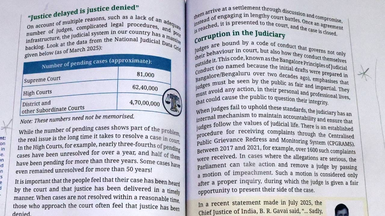 ರಾಷ್ಟ್ರೀಯ ಶೈಕ್ಷಣಿಕ ಸಂಶೋಧನೆ ಮತ್ತು ತರಬೇತಿ ಮಂಡಳಿ (NCERT) 8ನೇ ತರಗತಿಯ ಸಮಾಜ ವಿಜ್ಞಾನ ಪಠ್ಯಪುಸ್ತಕದಲ್ಲಿ ಹಲವಾರು ಬದಲಾವಣೆಗಳನ್ನು ಮಾಡಿದೆ. ವಿದ್ಯಾರ್ಥಿಗಳು ಈಗ ನ್ಯಾಯಾಂಗದ ಕಾರ್ಯನಿರ್ವಹಣೆಯ ಬಗ್ಗೆ ಮಾತ್ರವಲ್ಲದೆ ನ್ಯಾಯಾಂಗದಲ್ಲಿನ ಭ್ರಷ್ಟಾಚಾರ ಮತ್ತು ಮೊಕದ್ದಮೆಯ ಭಾರದಂತಹ ವ್ಯವಸ್ಥೆ ಎದುರಿಸುತ್ತಿರುವ ಸವಾಲುಗಳ ಬಗ್ಗೆಯೂ ಕಲಿಯುತ್ತಾರೆ. ಹಿಂದಿನ ಆವೃತ್ತಿಯು ಪ್ರಾಥಮಿಕವಾಗಿ ನ್ಯಾಯಾಲಯಗಳ ರಚನೆ ಮತ್ತು ನಾಗರಿಕ ಪ್ರವೇಶದ ಮೇಲೆ ಕೇಂದ್ರೀಕರಿಸಿದ್ದರಿಂದ ಇದು ಹಿಂದಿನ ಪುಸ್ತಕಕ್ಕಿಂತ ಗಮನಾರ್ಹ ಬದಲಾವಣೆಯಾಗಿದೆ.
